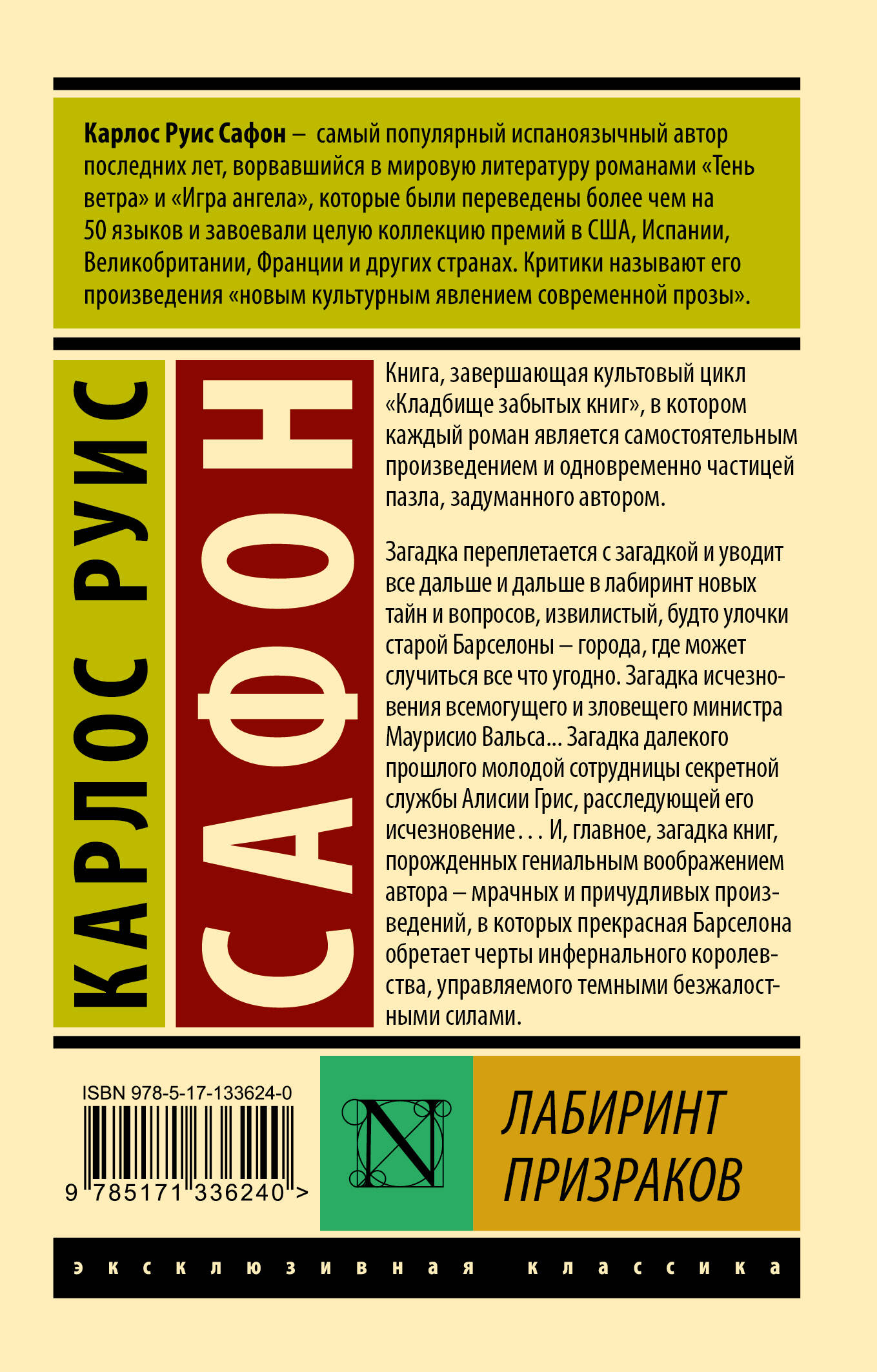 Последняя, завершающая книга культового цикла Карлоса Руиса Сафона "Кладбище Забытых книг", в который входят романы "Тень ветра", "Игра ангела" и "Узник неба". Загадка переплетается с загадкой и уводит все дальше и дальше в лабиринт новых тайн и вопросов, извилистый, будто улочки старой Барселоны - города, где может случиться все что угодно. Загадка исчезновения всемогущего и зловещего министра Маурисио Вальса... Загадка далекого прошлого молодой сотрудницы секретной службы Алисии Грис, расследующей его исчезновение… И, главное, загадка книг, порожденных гениальным воображением их автора - мрачных и причудливых произведений, в которых прекрасная Барселона обретает черты инфернального королевства, управляемого темными безжалостными силами.