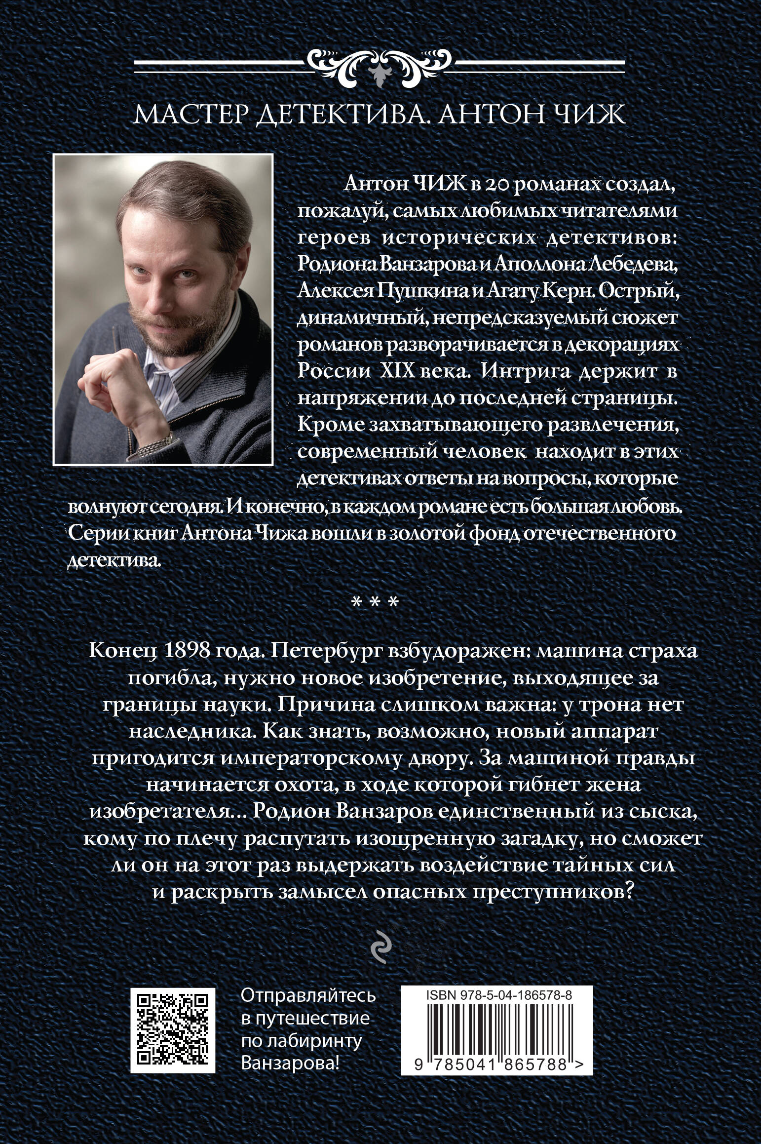 Конец 1898 года. Петербург взбудоражен: машина страха погибла, нужно новое изобретение, выходящее за границы науки. Причина слишком важна: у трона нет наследника. Как знать, возможно, новый аппарат пригодится императорскому двору. За машиной правды начинается охота, в ходе которой гибнет жена изобретателя… Родион Ванзаров единственный из сыска, кому по плечу распутать изощренную загадку, но сможет ли он в этот раз выдержать воздействие тайных сил и раскрыть замысел опасных преступников? Антон Чиж - популярный российский писатель детективов. Его книги изданы общим тиражом более миллиона экземпляров. По остросюжетным романам Антона Чижа были сняты сериалы «Агата и сыск. Королева брильянтов» и «Агата и сыск. Рулетка Судьбы». Писатель в 20 романах создал, пожалуй, самых любимых читателями героев исторических детективов: Родиона Ванзарова и Аполлона Лебедева, Алексея Пушкина и Агату Керн. Острый, динамичный, непредсказуемый сюжет романов разворачивается в декорациях России XIX века. Интрига держит в напряжении до последней страницы. Кроме захватывающего развлечения, современный читатель находит в этих детективах ответы на вопросы, которые волнуют сегодня. Серии книг Антона Чижа вошли в «золотой фонд» отечественного исторического детектива.