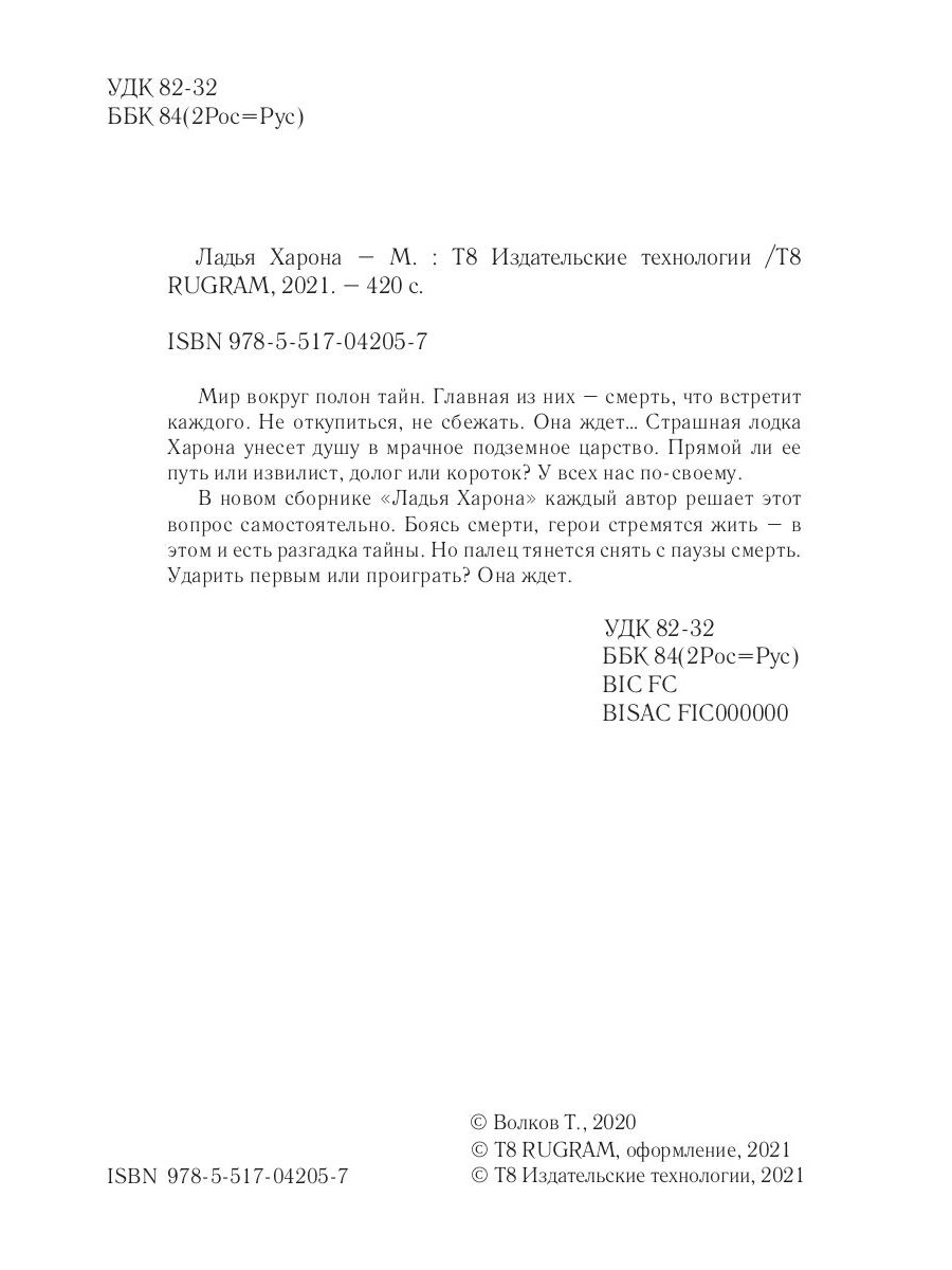 Мир вокруг полон тайн. Главная из них - смерть, что встретит каждого. Не откупиться, не сбежать. Она ждет… Страшная лодка Харона унесет душу в мрачное подземное царство. Прямой ли ее путь или извилист, долог или короток? У всех нас по-своему. В новом сборнике «Ладья Харона» каждый автор решает этот вопрос самостоятельно. Боясь смерти, герои стремятся жить - в этом и есть разгадка тайны. Но палец тянется снять с паузы смерть. Ударить первым или проиграть? Она ждет.| Издательство | Т8 RUGRAM |