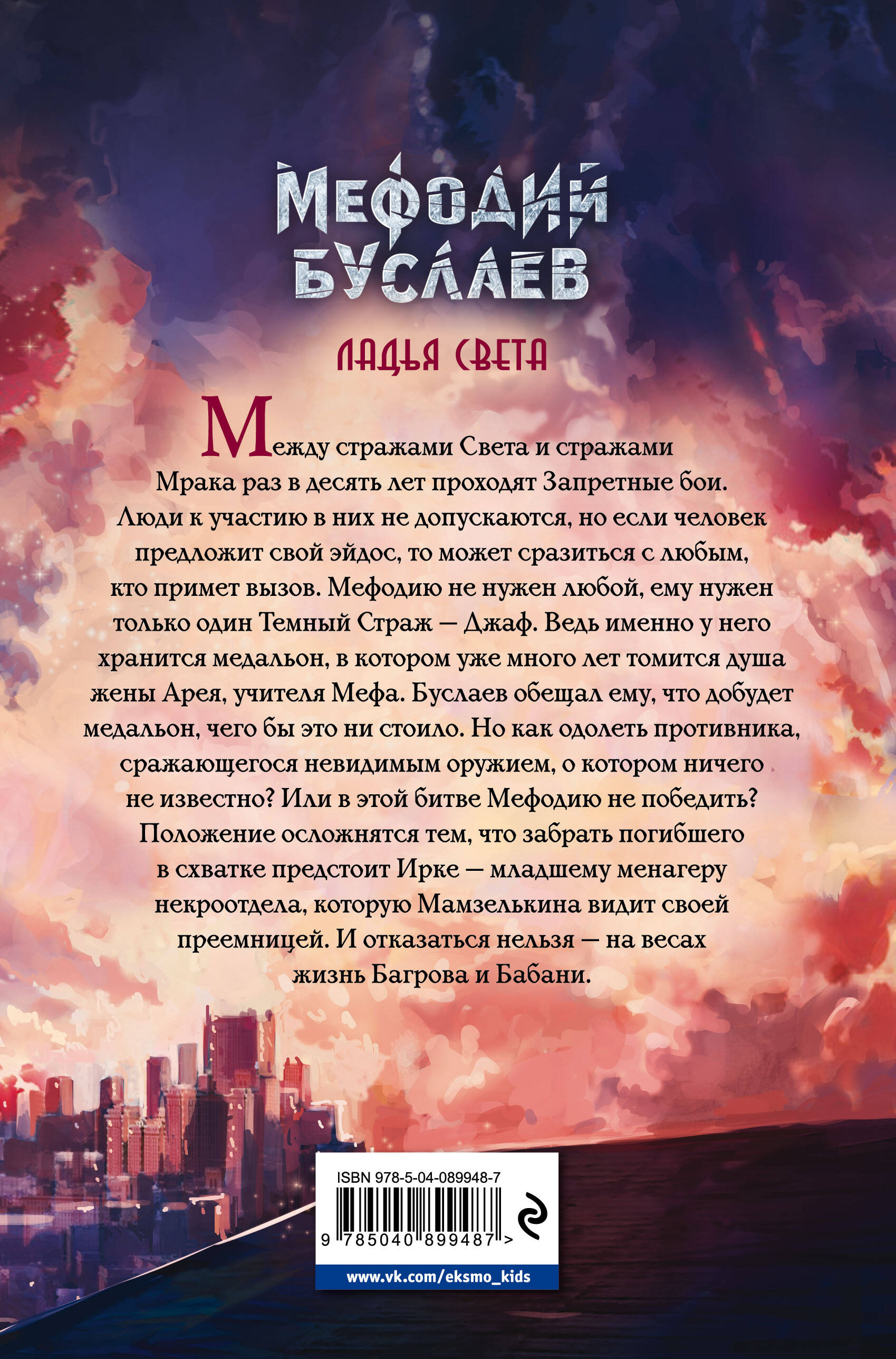 «Ладья Света» - семнадцатая книга серии «Мефодий Буслаев», в которой Мефу предстоит сразиться с тёмным стражем Джаффом. Он пообещал своему учителю Арею, что отобьёт у прислужника Мрака душу жены Арея. Правда, для этого ему придётся участвовать в Запретных боях. Но это табу и у Мрака, и у Света, а того, кто в них участвует, ждёт страшное наказание. Но Мефу всё равно, он дал слово своему учителю. Дмитрий Емец - известный детский писатель, суммарный тираж его книг превысил 5 миллионов экземпляров! «Мефодий Буслаев» - серия, с которой многие подростки полюбили мир книг и стали заядлыми читателями! Фанаты серии регулярно подтверждают это на встречах с автором. Из преданных читателей автора выросло целое поколение родителей, которые с радостью рекомендуют любимую серию, теперь уже своим детям. Каждая новая книга не только погружает в мир невероятных приключений и переживаний, но и предлагает задуматься над вечными ценностями.| Издательство | ООО "Издательство "Эксмо" |