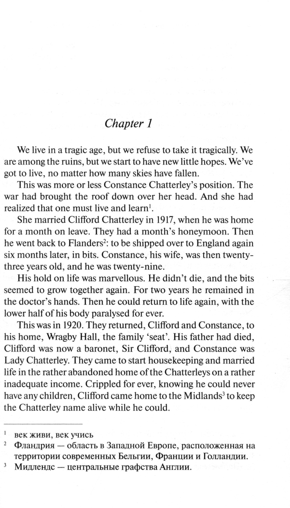 Почти сто лет назад роман буквально потряс своей откровенностью английское общество, что, по-видимому, и было главной целью Д. Лоуренса. Мечущаяся главная героиня Конни страдает от того, что муж вернулся с войны калекой и ему требуется постоянный уход. Она молода, и такая участь не для неё. Конни ищет выход своим ещё плохо осознаваемым страстям и не может понять, что с ней происходит. Кажется, она любит мужа и, начитавшись в молодости поэзии, знает, что настоящая любовь - это возвышенное, духовное чувство. Но покоя нет, её тело жаждет другой, телесной любви. И выбор объекта не так уж важен. Им становится егерь Меллорс - довольно странный, отрешённый от жизни человек, не нашедший себя, ненавидящий всех и всё вокруг. Но своей готовностью отдаться ему целиком Конни подкупает Меллорса, и он становится на путь, который может привести их к счастью. Эта книга - гимн чувственности, которая становится любовью, если её питает нежность. Текст сокращён и адаптирован. Уровень Intermediate.