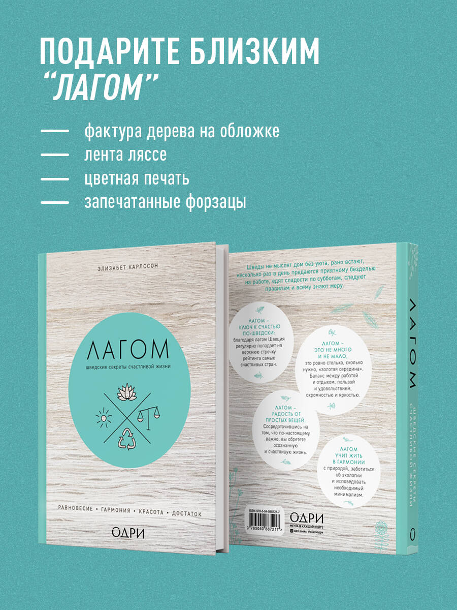 О книге Шведы не мыслят дом без уюта, рано встают, несколько раз в день предаются приятному безделью на работе, едят сладости по субботам, следуют правилам и во всем знают меру. Лагом - это шведская философия жизни, ключ к счастью по-шведски: благодаря лагом Швеция регулярно попадает на верхнюю строчку рейтинга самых счастливых стран. Лагом - это не много и не мало, это ровно столько, сколько нужно, «золотая середина». Это баланс между работой и отдыхом, пользой и удовольствием, скромностью и яркостью. Лагом учит жить в гармонии с природой, заботиться об экологии и исповедовать необходимый минимализм. Лагом - это радость от простых вещей. Сосредоточившись на том, что по-настоящему важно, вы обретете осознанную и счастливую жизнь. Особенности оформления Фактура дерева на обложке, лента ляссе, белоснежные страницы, цветная печать, запечатанные форзацы. Лучший подарок к сезону! Об авторе Элизабет Карлссон родилась и выросла в Швеции, жила в Мадриде и Нью-Йорке, а в данный момент живет в Лондоне с мужем, двумя детьми и кошкой. Элизабет долгое время работала в издательском бизнесе, но сейчас переквалифицировалась во врача-диетолога. Поддерживать равновесие в жизни, полной хаоса и суеты, ей помогают простые удовольствия в стиле лагом: фика, выращивание овощей и вечера при свечах, изготовленных вручную ее матерью.| Издательство | ООО "Издательство "Эксмо" |
