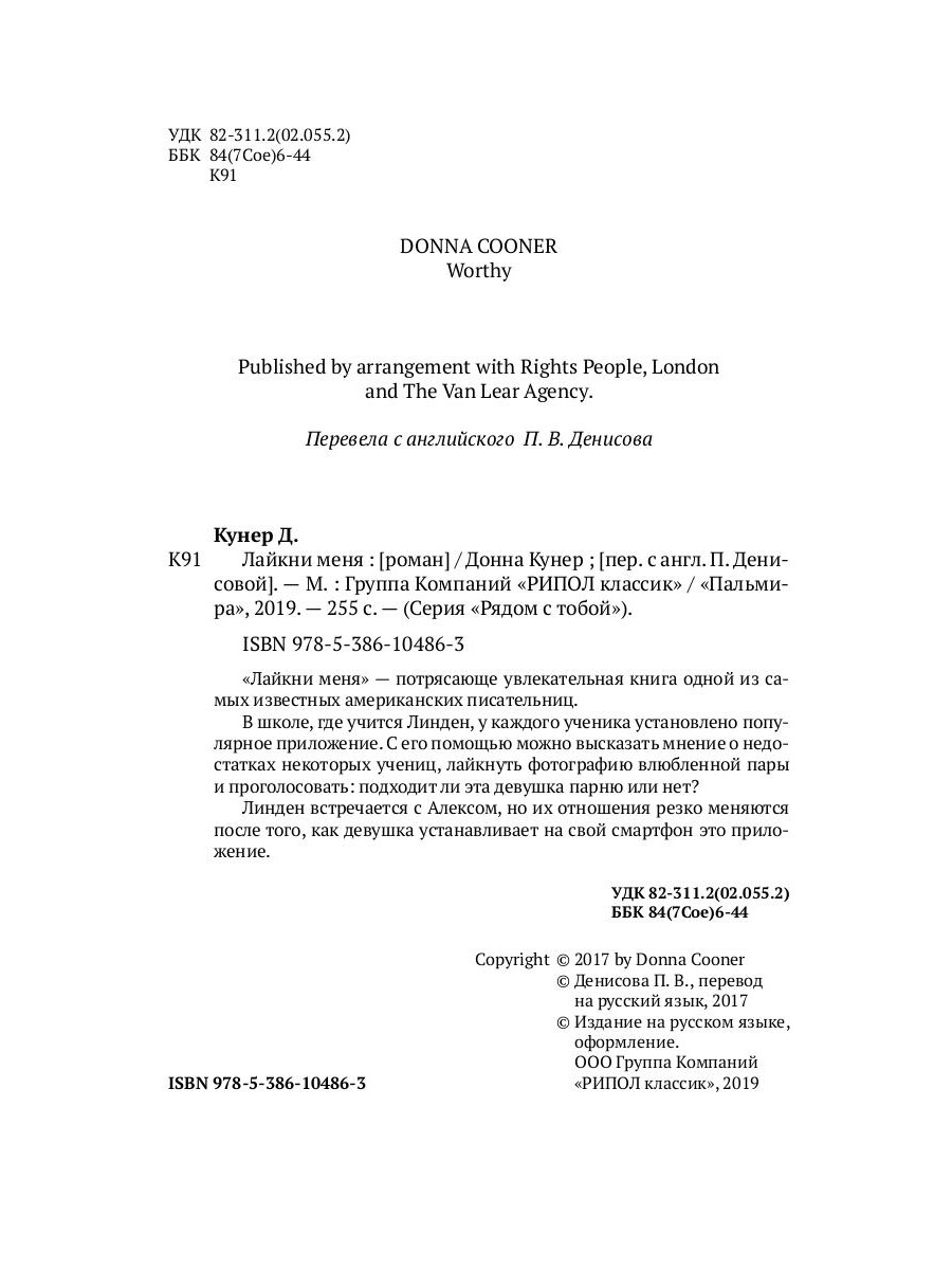 «Лайкни меня» - потрясающе увлекательная книга одной из самых известных американских писательниц. В школе, где учится Линден, у каждого ученика установлено популярное приложение. С его помощью можно высказать мнение о недостатках некоторых учениц, лайкнуть фотографию влюбленной пары и проголосовать: подходит ли эта девушка парню или нет? Линден встречается с Алексом, но их отношения резко меняются после того, как девушка устанавливает на свой смартфон это приложение.| Издательство | Рипол Классик |