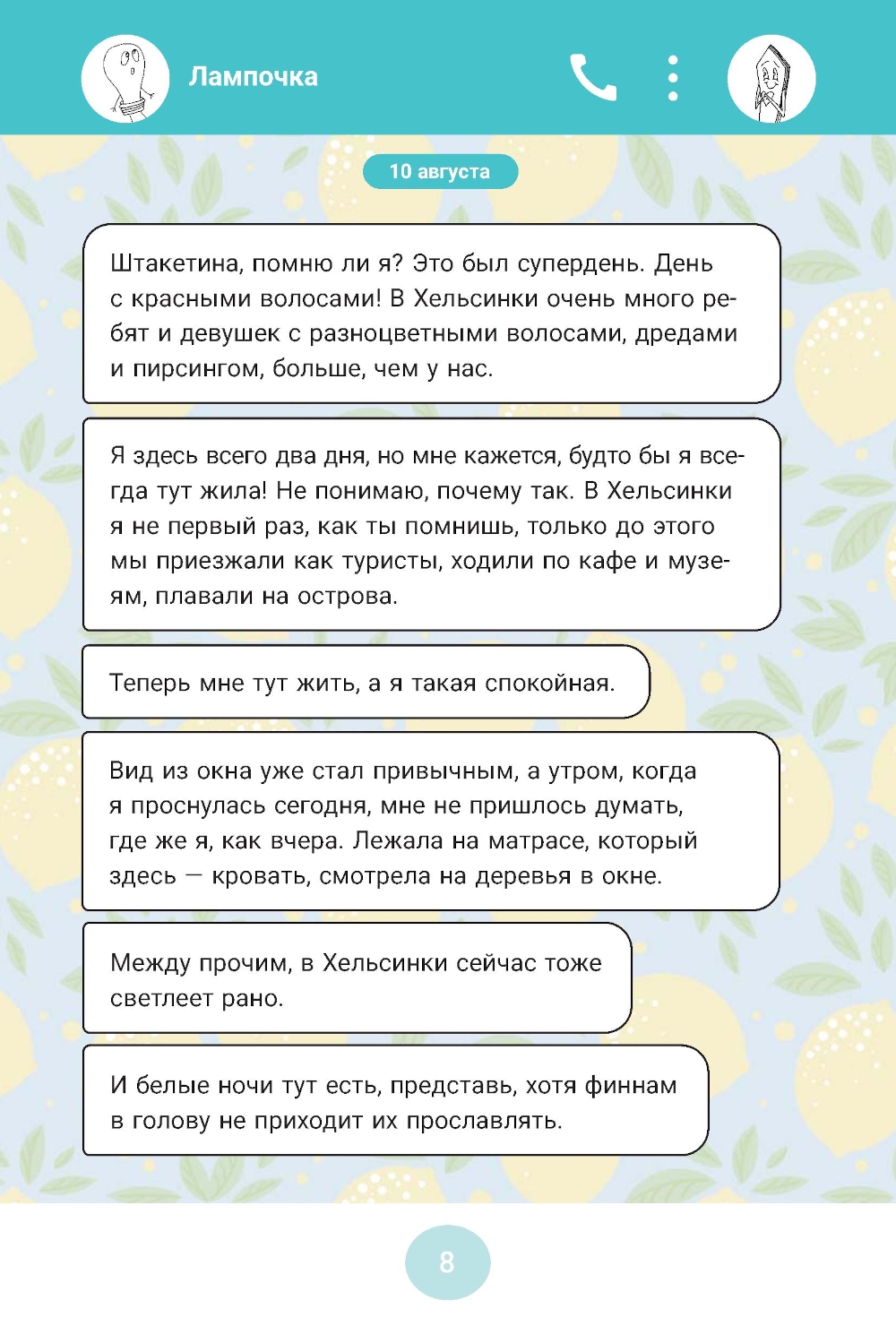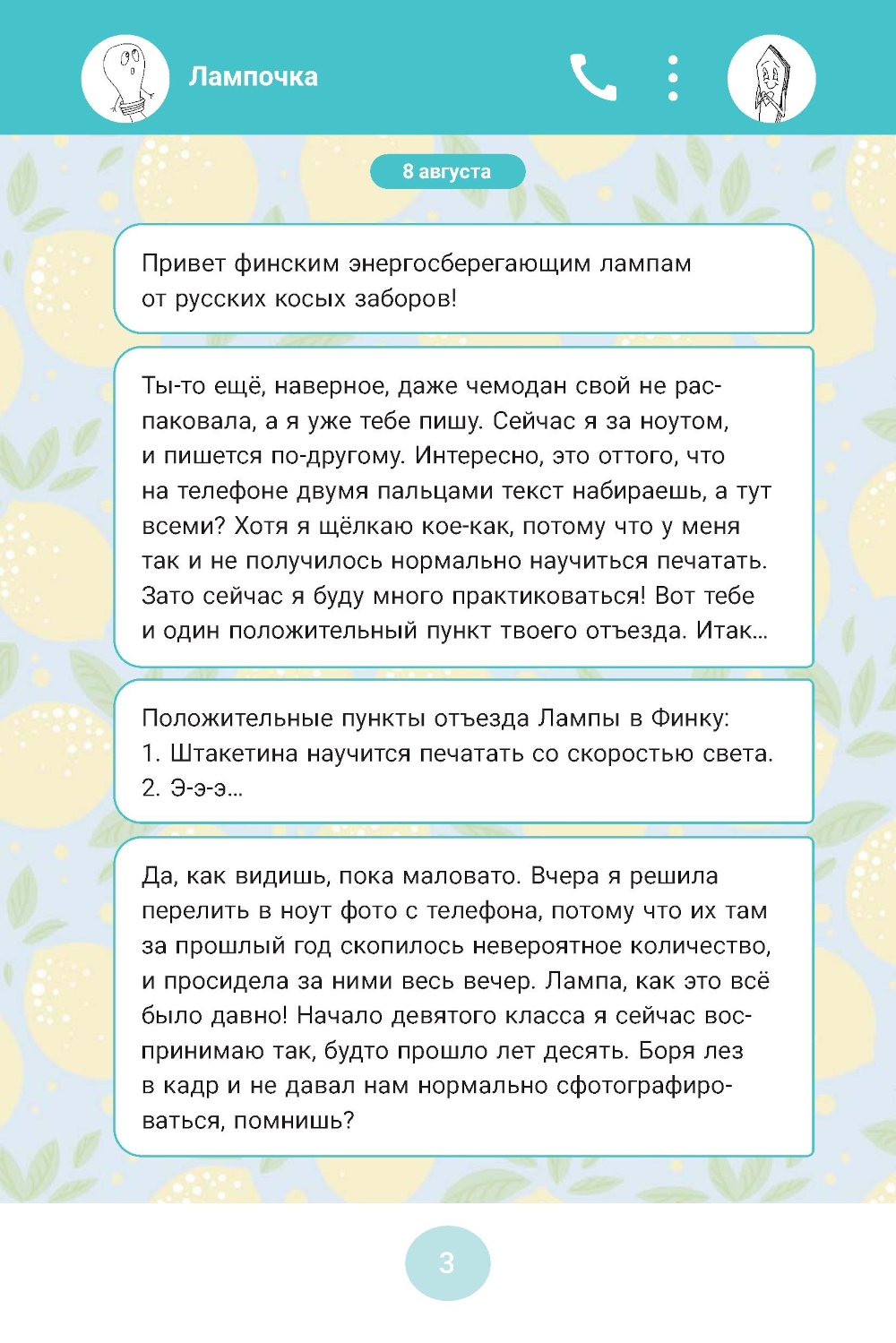 Вы, может быть, думали, что эпистолярные повести и романы ушли в прошлое? Ведь бумажные письма навсегда остались в прошедших столетиях... Но теперь переписка кипит в мессенджерах и социальных сетях, а значит, и жанр остаётся - только становится более стремительным и пестрит смайлами и фотографиями. Лампочка (Ксения Лампова) и Штакетина (Ева Белова) - лучшие подруги, учатся в одном классе и всё свободное время привыкли проводить вместе. Но в десятый класс они идут порознь: Ксения уезжает в Финляндию, а Ева остаётся в Санкт-Петербурге. Поначалу кажется, что их дружбе ничего не грозит, ведь благодаря смартфону можно постоянно находиться на связи. Но перемены, которые происходят в жизни Ксении, оставляют всё меньше времени на общение с Евой. Удастся ли им сохранить дружбу?