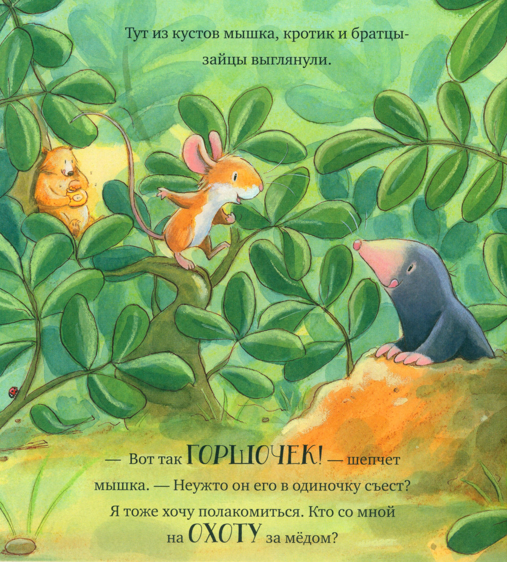 У медведя есть большо-о-ой горшок вкуснейшего меда. И он не намерен ни с кем делиться! Но мышка, кротик и братцы-зайцы о-о-очень голодные. Смогут ли они пробраться через заросли густого леса и заполучить мед так, чтобы грозный медведь их не заметил? История от любимой Джейн Чапмен, неожиданная развязка и юмор - всё это вы найдёте в книжке «Лапы прочь от мёда!»| Издательство | Клевер-Медиа-Групп |