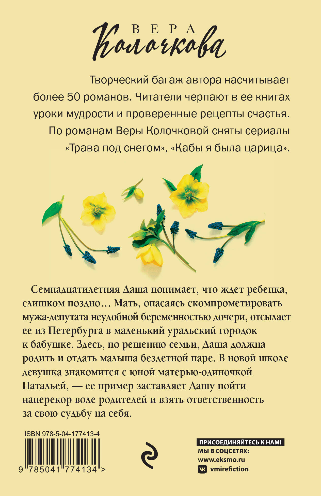 Библиография Веры Колочковой насчитывает более 40 романов, многие из которых уже воплощены на экране. Любовь к автору вполне объяснима, ведь она пишет об обычных людях, которые стремятся к лучшей жизни и борются за собственное счастье. Простые и чувственные, увлекательные и романтичные, романы Колочковой задевают за живое, заставляя сопереживать и радоваться героям как своим знакомым. Семнадцатилетняя Даша понимает, что ждет ребенка, слишком поздно… Мать, опасаясь скомпрометировать мужа-депутата неудобной беременностью дочери, отсылает ее из Петербурга в маленький уральский городок к бабушке. Здесь, по решению семьи, Даша должна родить и отдать малыша бездетной паре. В новой школе девушка знакомится с юной матерью-одиночкой Натальей, - ее пример заставляет Дашу пойти наперекор воле родителей и взять ответственность за свою судьбу на себя.| Издательство | ООО "Издательство "Эксмо" |