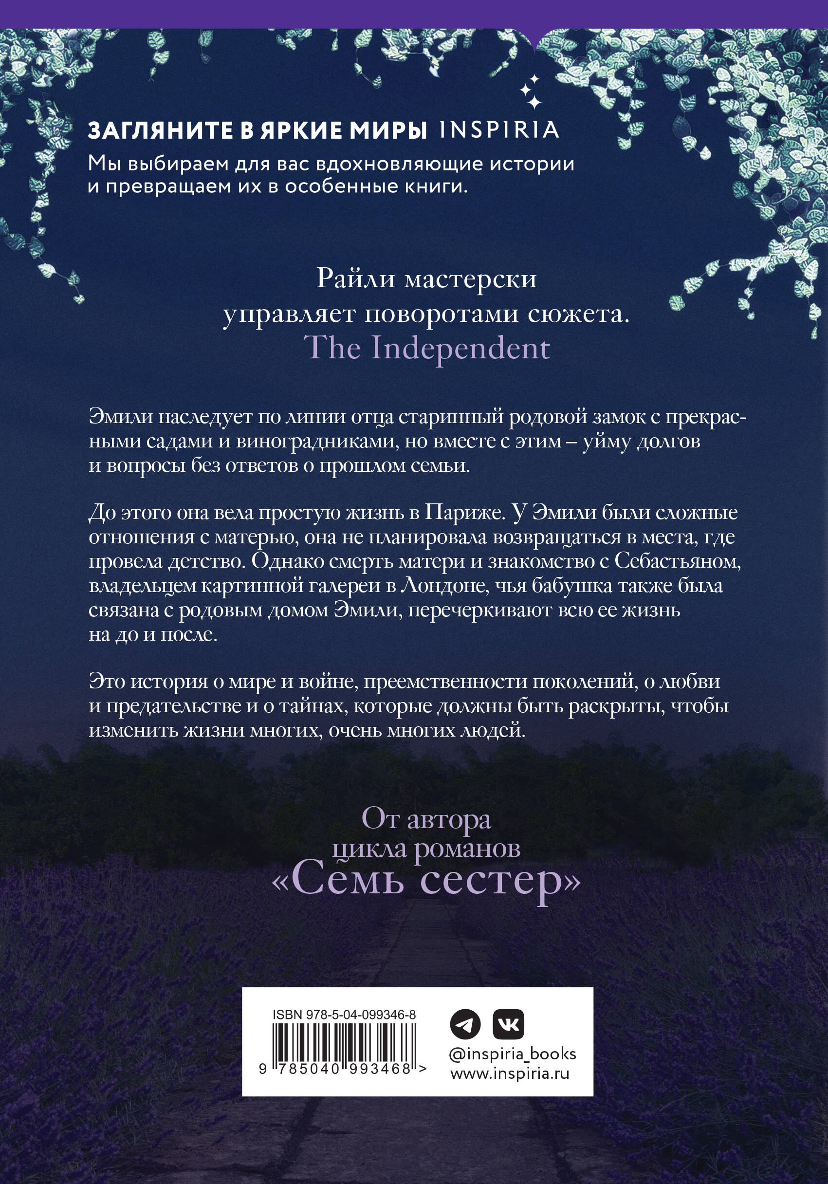 ОТ АВТОРА «СЕМИ СЕСТЕР». Это история о мире и войне, преемственности поколений, о любви и предательстве, и о тайнах, которые должны быть раскрыты, чтобы изменить жизни многих, очень многих людей. Эмили наследует по линии отца старинный родовой замок с прекрасными садами и виноградниками, но вместе с этим - уйму долгов и вопросы без ответов о прошлом семьи. До этого она вела простую жизнь в Париже. У нее были сложные отношения с матерью, она не планировала возвращаться в места, где провела детство. Однако смерть матери и знакомство с Себастьяном, владельцем картинной галереи в Лондоне, чья бабушка также была связана с родовым домом Эмили, перечеркивают всю ее жизнь на до и после. «Семейные тайны, шпионаж военного времени и верность, которую приходится поставить на карту. Все это "Лавандовый сад" - идеальная книга для поклонников исторических романов». - The Booklist *** Люсинда Райли родилась в 1965 году в Ирландии и прославилась как актриса театра и кино. Ее жизнь изменилась после публикации дебютного романа. Самое известное произведение, цикл романов «Семь сестер», стал международным хитом, переведен на 37 языков и номинирован на множество премий. Ведутся переговоры о создании сериала. В 2020 году Люсинда Райли получила в Голландии Платиновую награду за количество проданных книг - последний раз эту награду получила Джоанн Роулинг за цикл романов о Гарри Поттере. Люсинда Райли прожила много лет в городе Норфолк, Англии, пока не осуществила давнюю мечту - купила уединенный фермерский дом на родине, в Ирландии, где и были написаны последние пять книг. Люсинда Райли мирно ушла из жизни в июне 2021 года, в окружении близких людей.| Издательство | ООО "Издательство "Эксмо" |