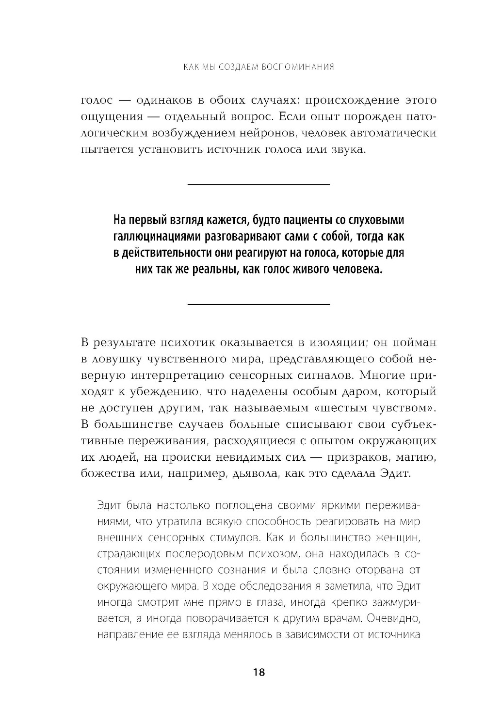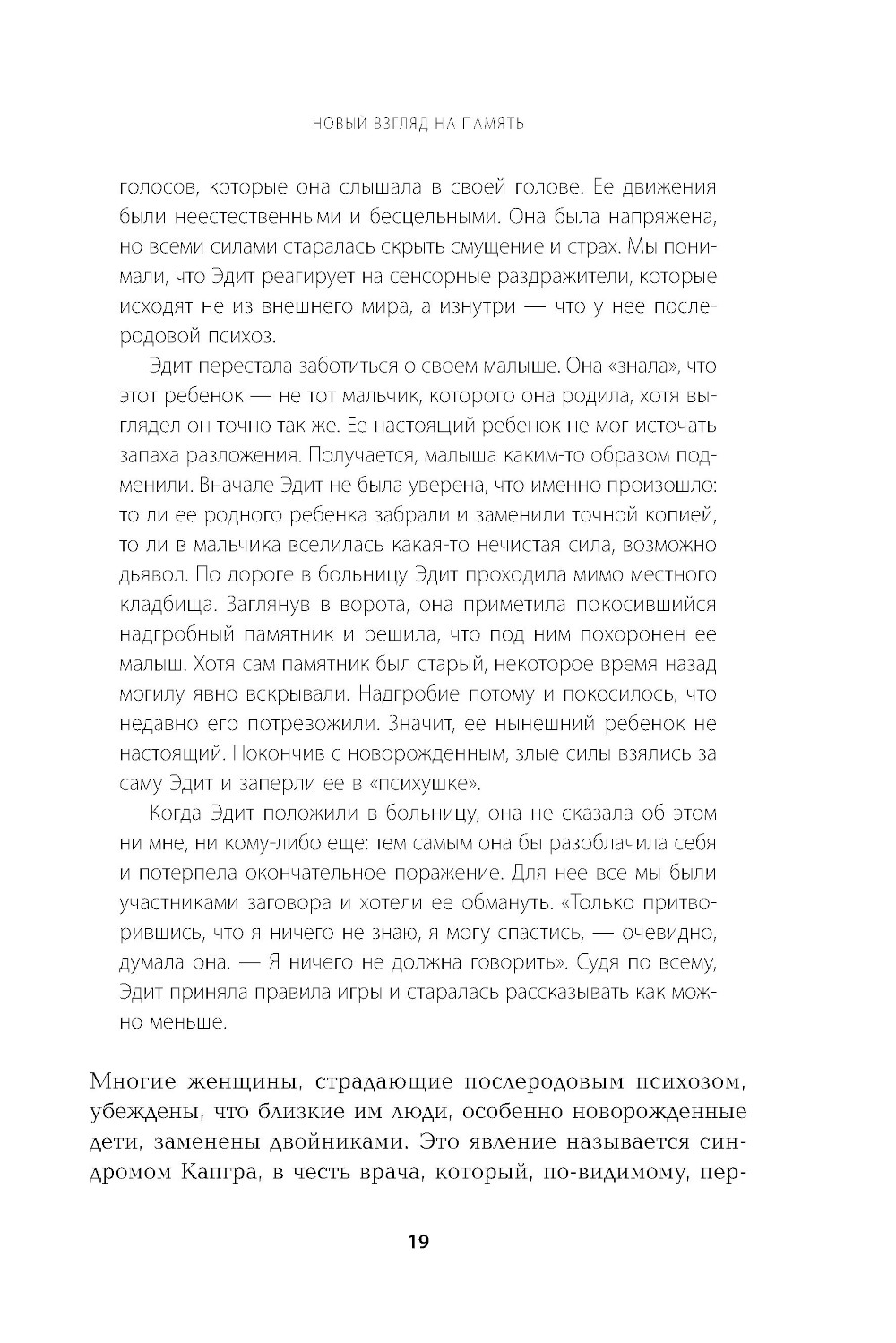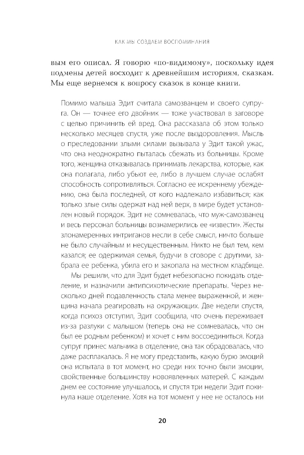 Сразу после родов Эдит перестала заботиться о своем малыше. Мать была убеждена, что ребенок в ее руках не тот, кого она родила. Эдит верила, что малыша, а затем и мужа, подменили злые силы, а вокруг нее заговор. Именно эта история положила начало долгому научному исследованию психиатра Вероника О'Кин о природе памяти. Почему же память заставляет переживать события заново и мы в подробностях помним то, чего никогда не было? Автор приводит пронзительные истории своих пациентов, в которые трудно поверить. На протяжении 36 лет она исследует мозг и раскрывает: как воспоминания формируют нас и определяют будущее каждого человека. Вероника О'Кин использует последние нейробиологические исследования, чтобы ответить на вопросы: почему воспоминания могут вызывать в нас дрожь или, наоборот, прилив сил; почему мы чувствуем запахи и прикосновения, которых нет на самом деле; существуют ли «истинные» и «ложные» воспоминания; как убедиться в том, что происходящее вокруг нас сейчас - реально; каким образом фольклор и литература помогают ученым в изучении памяти.| Издательство | Эксмо |