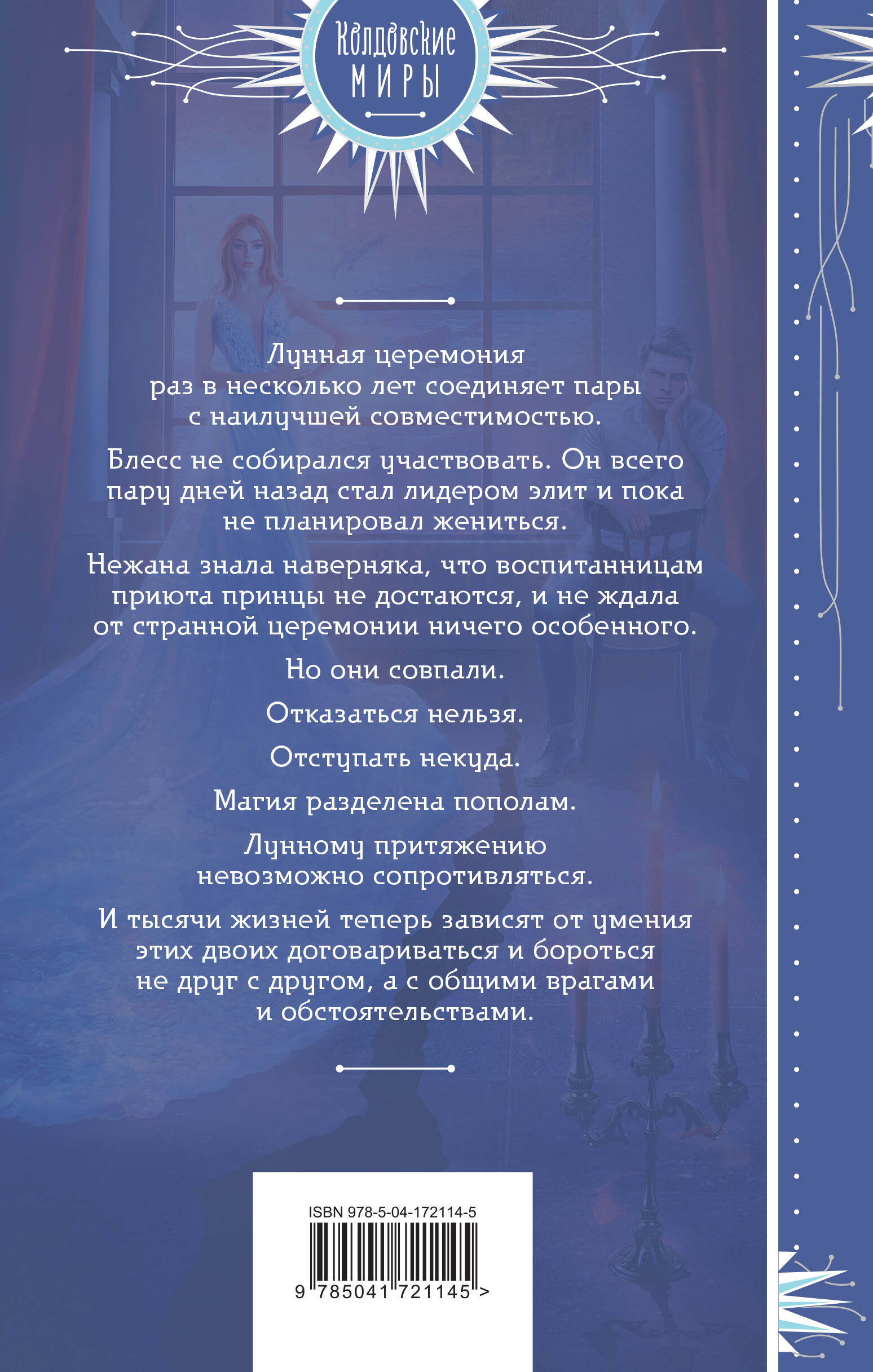 Лунная церемония раз в несколько лет соединяет пары с наилучшей совместимостью. Блесс не собирался участвовать. Он всего пару дней назад стал лидером элит и пока не планировал жениться. Нежана знала наверняка, что воспитанницам приюта принцы не достаются, и не ждала от странной церемонии ничего особенного. Но они совпали. Отказаться нельзя. Отступать некуда. Магия разделена пополам. Лунному притяжению невозможно сопротивляться. И тысячи жизней теперь зависят от умения этих двоих договариваться и бороться не друг с другом, а с общими врагами и обстоятельствами. 1. Хотите в начале зимы перенестись на жаркое побережье? Тогда эта история для вас! 2. На пути к счастью героям придется раскрыть заговор, разобраться в тайнах прошлого, поймать преступников, найти верных друзей… и, возможно, себя настоящих. 3. Возможно ли потерять голову от человека, которого выбрала для тебя древняя церемония, при условии, что у вас нет ничего общего? Спойлер: да! 4. Дельфины и очаровательный золотистый пес заставят умиляться и улыбаться. 5. Переживать за героев придется до последней строчки!| Издательство | ООО "Издательство "Эксмо" |