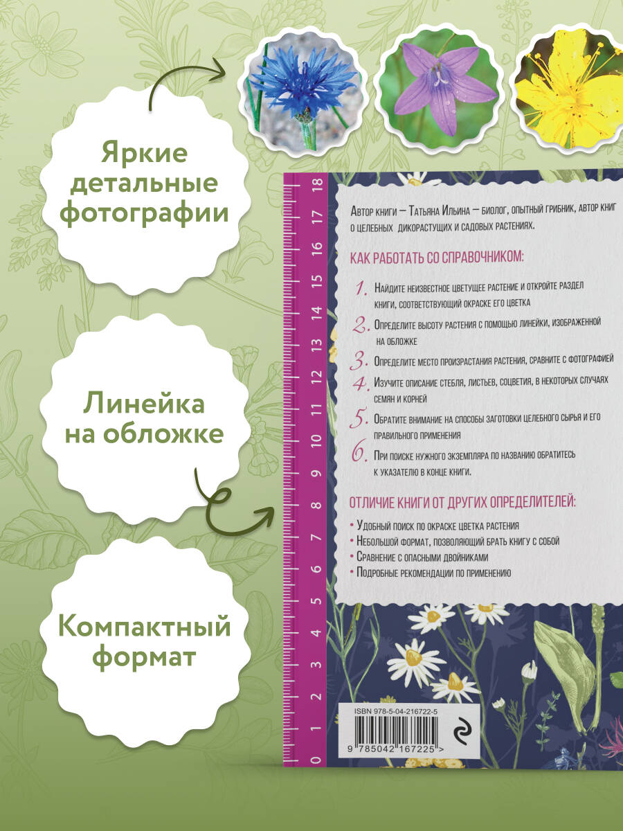 Татьяна Александровна Ильина - кандидат биологических наук, автор уникальных энциклопедий о лесных и садовых растениях, человек, обладающий огромным опытом сбора целебных трав, представляет свою новую книгу, посвященную сбору и применению лекарственных растений. Для всех, кто хочет обрести здоровье, не применяя дорогостоящие химические лекарственные препараты. Удобная группировка по цвету венчика цветка, цветные фотографии и линейка на обложке помогут с легкостью идентифицировать находку. Кроме того, книга имеет небольшой формат, благодаря чему ее всегда удобно взять с собой.