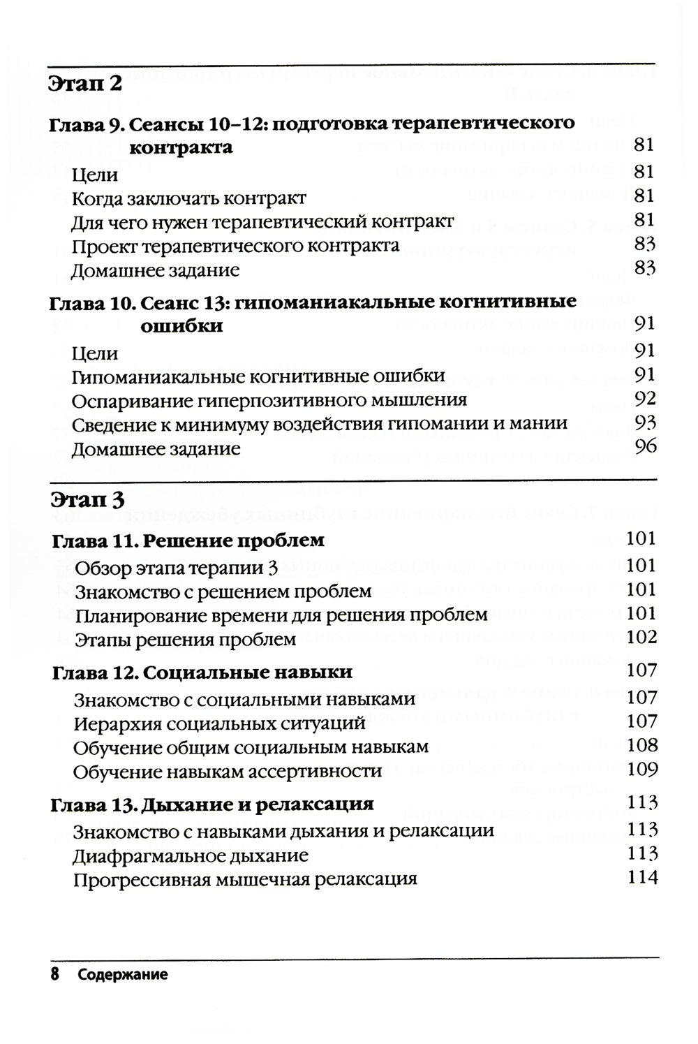 Справиться с симптомами биполярного расстройства и стабилизировать настроение непросто, но предлагаемая в книге программа помогает добиться хороших результатов. Она представляет собой курс лечения, поддерживаемый фармакотерапией, который состоит из 30 сеансов и разделен на четыре этапа, каждый со своими задачами и целями. На первом этапе пациент обучается навыкам и стратегиям преодоления депрессивной фазы расстройства и стабилизации настроения. На втором этапе вместе с психотерапевтом он составляет терапевтический контракт, информирующий его родных и друзей о действиях при обострении расстройства. На третьем этапе терапия индивидуализируется и концентрируется на конкретных проблемах пациента. Четвертый этап посвящен техникам профилактики рецидивов. Главная цель программы - не в том, чтобы вылечить расстройство, а в том, чтобы научить пациента эффективно управлять им, чтобы вести полноценную и счастливую жизнь.