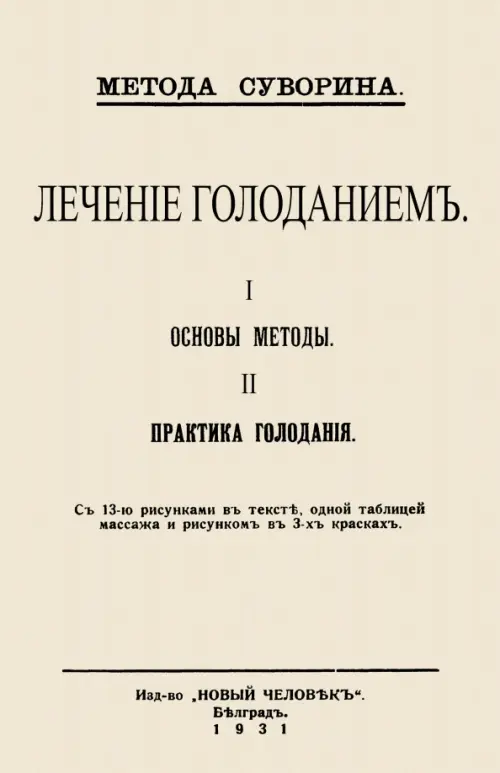 Репринт с издания. Белград, 1931. Суворин Алексей Алексеевич (1862-1937). публицист, писатель и издатель, отв. редактора газеты «Новое время», популяризатор лечебного голодания, яркий и талантливый представитель альтернативной медицины, эмигрант, старший сын крупнейшего отечественного издателя А. С. Суворина (1834-1912). Псевдоним Алексей Порошин. В зрелом возрасте он стал врачом, окончив Белградский медицинский институт. В своей лечебной практике А. А. Суворин разработал эффективную методику лечебного голодания, лечение по которой можно проводить в домашних условиях. Его методика лечения болезней голоданием отличается простотой и физиологичностью. Она доступна практически всем людям любого возраста, но требует при ее применении строжайшей дисциплины и знания. Методика лечебного голодания является первым шагом не только к лечению болезней, но и первым шагом к здоровому образу жизни. Девиз А. А. Суворина «пища должна быть вкусна, дешева и доступна» особое значение имеет и в наши дни, когда питание людей по стоимости и составу продуктов не соответствует физиологическим потребностям человека. Тираж 30 экз. выполнен по технологии print-on-demand.