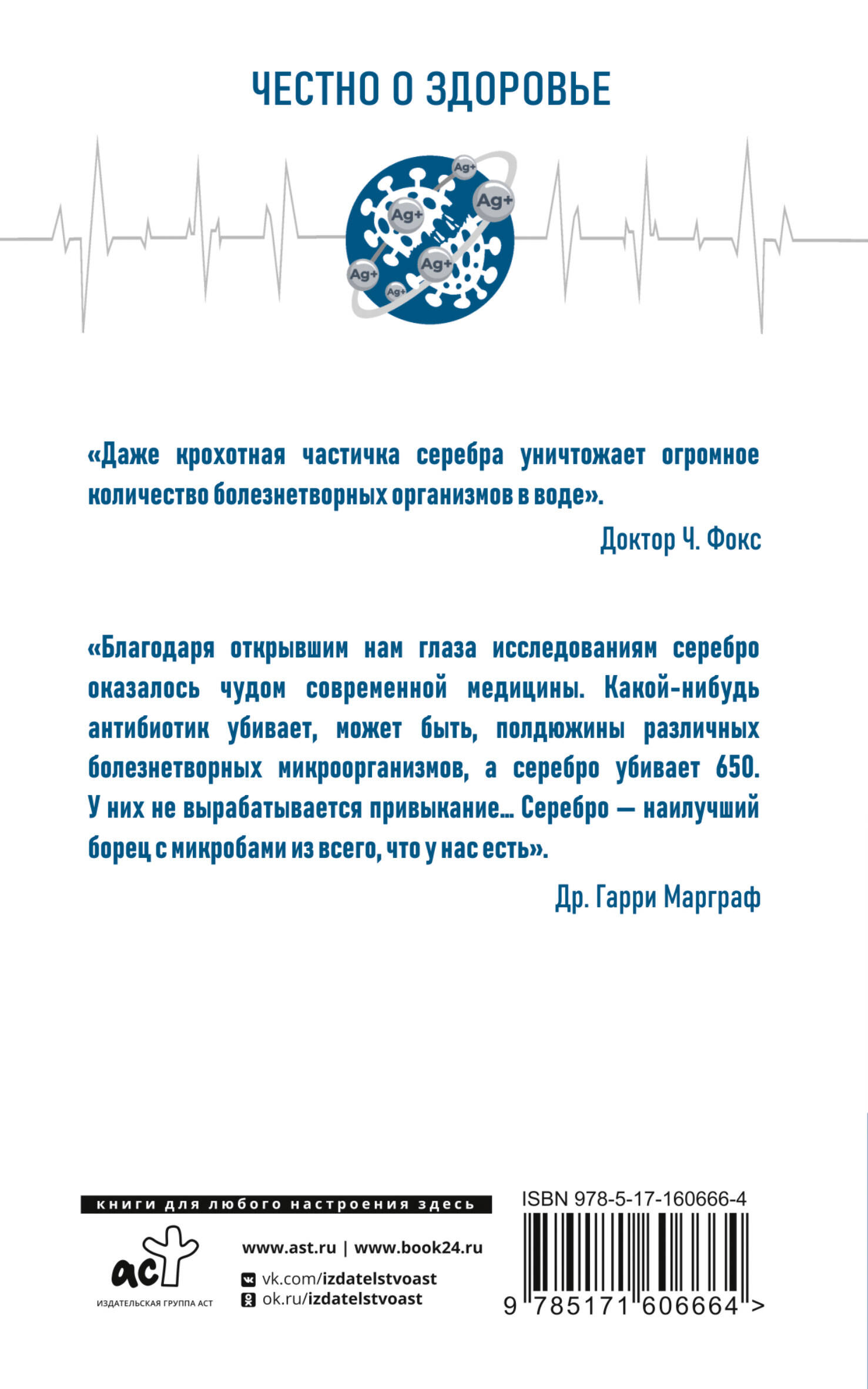 В этой книге вы найдете описание методик лечения и дозировок препаратов серебра при лечении внутренних органов, дыхательной системы, полости рта, заболеваний глаз, кожи, применение этих препаратов в травматологи и хирургии, педиатрии, гинекологии и урологии, при лечении сахарного диабета. Узнаете о целебных свойствах и благотворном влиянии серебряной воды на организм человека, а также о способах её приготовления и хранения.| Издательство | ИЗДАТЕЛЬСТВО "АСТ" |