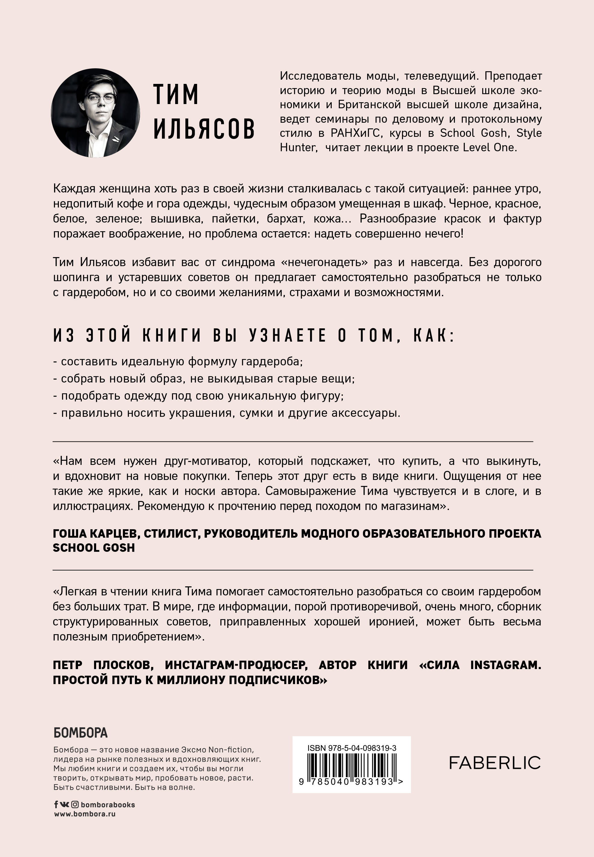 Тим Ильясов - исследователь моды, стилист и телеведущий - обратился к женщинам с решением главной проблемы женского гардероба: "нечегонадеть". Он советует отказаться от услуг профессиональных стилистов и не рекомендует читательницам выкидывать всю одежду ради дорогостоящего шопинга, но предлагает изящные решения. Тим расскажет, как точно узнать свой тип фигуры, какие аксессуары надевать с V-вырезом, почему цветные колготки - это совсем не страшно, и как полюбить себя настоящую. Все практические советы он иллюстрирует реальными историями, в которых женщины под его руководством преобразились до неузнаваемости. Возьмите бокал игристого и начните свой путь в мир моды! С Тимом Ильясовым это путешествие к стильной версии себя будет легким и увлекательным.| Издательство | ООО "Издательство "Эксмо" |