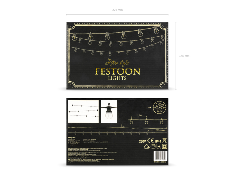 LED Festoon lights Retro, clear on black wire, length of wire with lights approx. 5 m, additional wire approx. 3 m, 10 round bulbs, warm yellow colour of the light. Suitable for both indoor and outdoor use. Lights can be connected with maximal 5 sets. Doesn't contain UK plug. Rated voltage: 24V; Rated power: 8.4W; Bulb power: 20mA, 24V; 2200K