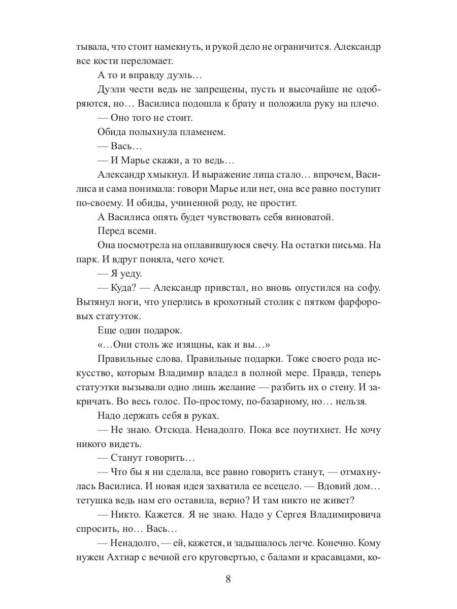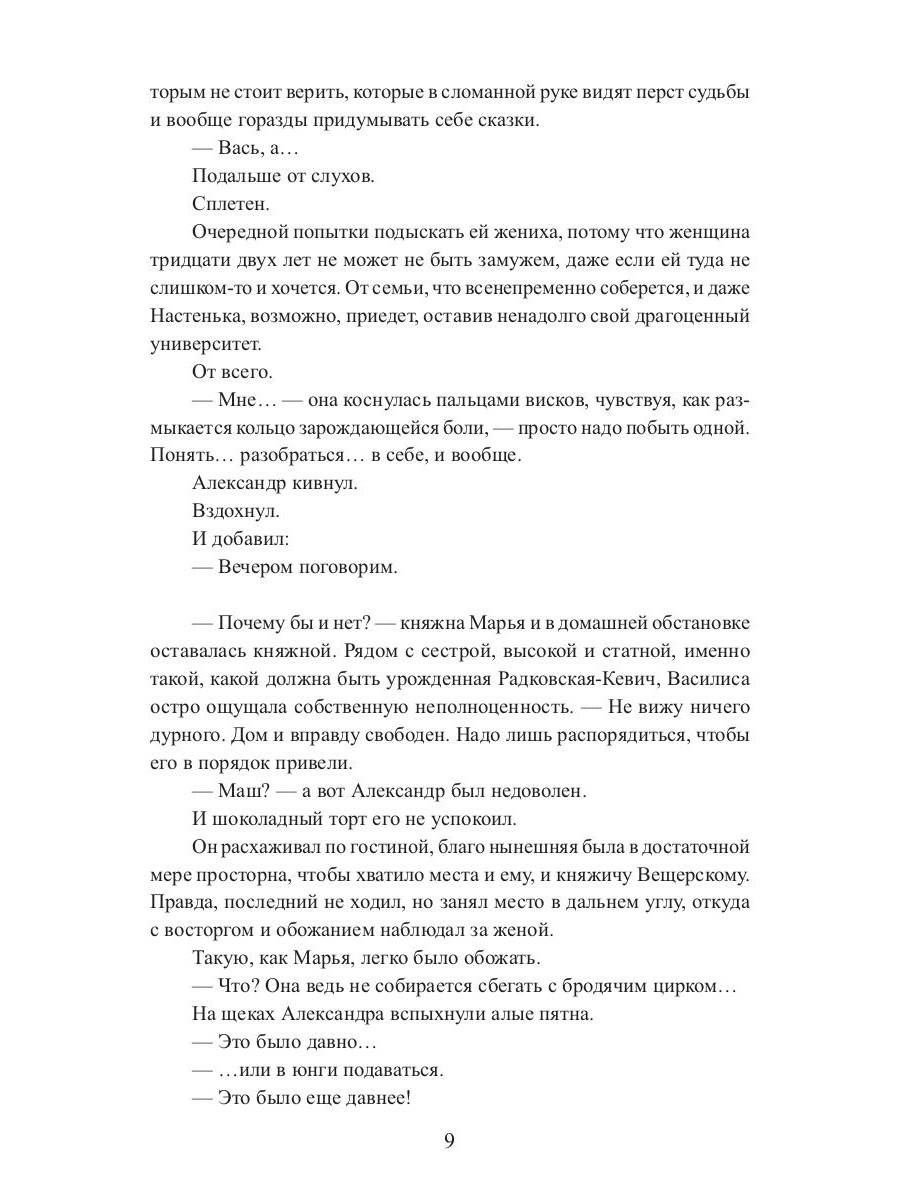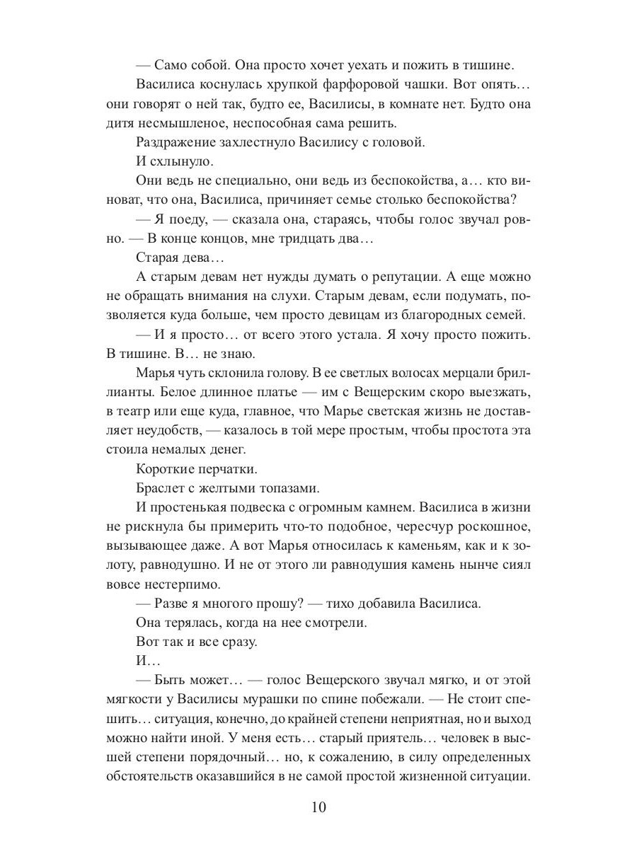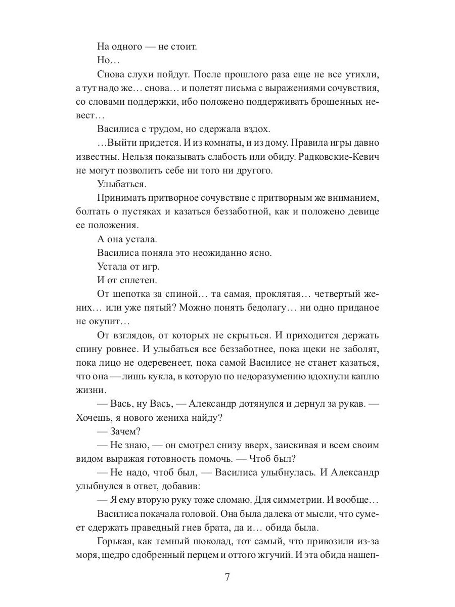 Василисе, третьей дочери князя Радковского-Кевич, не досталось ни красоты и силы старшей сестры, ни ума средней. Из всего наследия рода она получила странную внешность прабабки-степнячки, любовь к лошадям, умение готовить и проклятье, разрушившее всякую надежду на брак. И что остается старой деве, кроме как вовсе удалиться от света, если не на край мира, то почти? Благо, остался от тетушки на Крымском берегу старый дом, где Василиса когда-то была счастлива, конюшни и семейные тайны, разгадать которые придется, ведь прошлое порой куда ближе, чем кажется.| Издательство | Т8 RUGRAM |