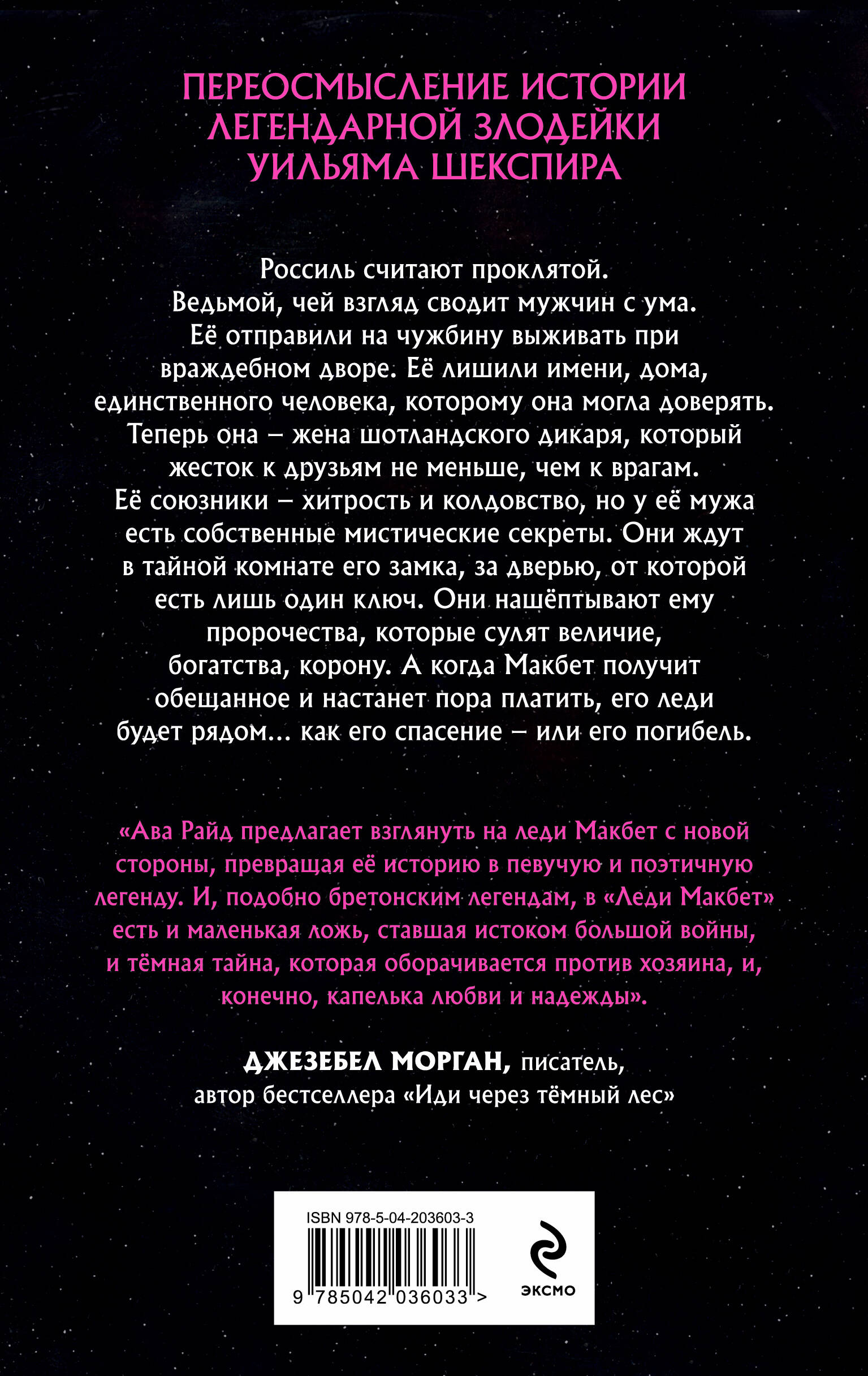 Россиль считают проклятой. Ведьмой, чей взгляд сводит мужчин с ума. Её отправили на чужбину, выживать при враждебном дворе. Её лишили имени, дома, единственного человека, которому она могла доверять. Теперь она - жена шотландского дикаря, который жесток к друзьям не меньше, чем к врагам. Её союзники - хитрость и колдовство, но у её мужа есть собственные мистические секреты. Они ждут в тайной комнате его замка, за дверью, от которой есть лишь один ключ. Они нашёптывают ему пророчества, которые сулят величие, богатства, корону. А когда Макбет получит обещанное и настанет пора платить, его леди будет рядом… как его спасение - или его погибель. Бестселлер New York Times с первой же недели продаж! Выбор редакции Amazon, хвалебные отзывы иностранных авторов (Ханна Уиттен, Шелли Паркер-Чан, Сью Линн Тань). Готический ретеллинг трагедии Уильяма Шекспира «Макбет» с политическими интригами, романтикой, ведьмами и знаменитой злодейкой в главной роли. Прекрасное издание с суперобложкой и ярким твёрдым переплётом + иллюстрации на форзаце от художницы Karma Virtanen.| Издательство | ООО "Издательство "Эксмо" |