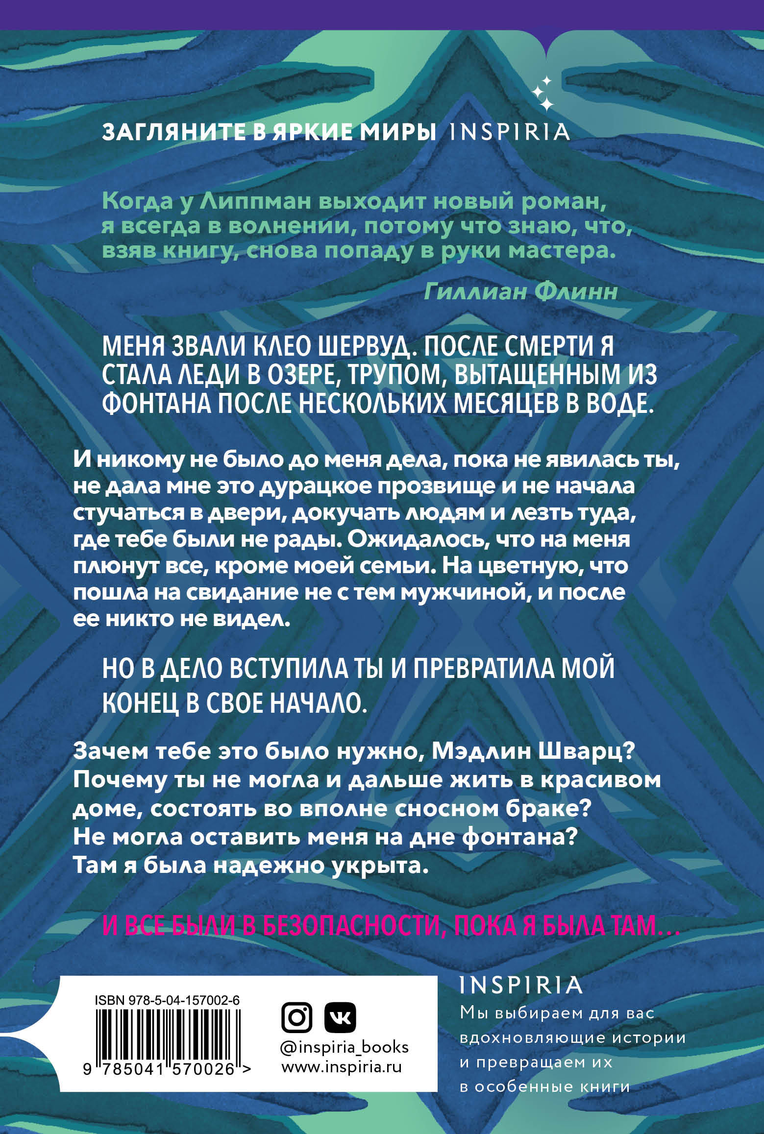 БЕСТСЕЛЛЕР NEW YORK TIMES. ОТ ЛАУРЕАТА ПРЕМИИ ЭДГАРА АЛЛАНА ПО. Скоро экранизация с обладательницами «Оскара» НАТАЛИ ПОРТМАН и ЛУПИТОЙ НИОНГО. Смерть меняет людей. Видит бог, моя собственная изменила меня. Меня звали Клео Шервуд. После смерти я стала Леди в озере, трупом, вытащенным из фонтана после нескольких месяцев в воде. И никому не было до меня дела, пока не явилась ты, не дала мне это дурацкое прозвище и не начала стучаться в двери, докучать людям и лезть туда, где тебе были не рады. Ожидалось, что на меня плюнут все, кроме моей семьи. На цветную, что пошла на свидание не с тем мужчиной, и после ее никто не видел. Но в дело вступила ты и превратила мой конец в свое начало. Зачем тебе это было нужно, Мэдлин Шварц? Почему ты не могла и дальше жить в красивом доме, состоять во вполне сносном браке? Не могла оставить меня на дне фонтана? Там я была надежно укрыта. И все были в безопасности, пока я была там… -------------------------------------------------- «Почему эта книга особенная, даже выдающаяся? Вот почему: остросюжетная загадка здесь лишь фон. Основная же тема - огромный разрыв между настоящими стремлениями женщин и теми, которых от них ожидали». - Стивен Кинг «Когда у Липпман выходит новый роман, я всегда в волнении, потому что знаю, что, взяв книгу, снова попаду в руки мастера». - Гиллиан Флинн «Роман, заставляющий маниакально читать его, думать о нем, болеть им». - Vanity Fair «Одна из лучших романисток, и точка». - Washington Post «Сюжет здесь гораздо значительнее, чем лежащее в его основе преступление, а преступление - гораздо значительнее своей разгадки. Захватывающая ретро-драма». - Kirkus Reviews «Потрясающий рассказ о настойчивой женской самореализации оборачивается картиной самого духа того времени». - Publishers Weekly «Триумф повествовательного мастерства и саспенса». - Daily Mail| Издательство | Эксмо |