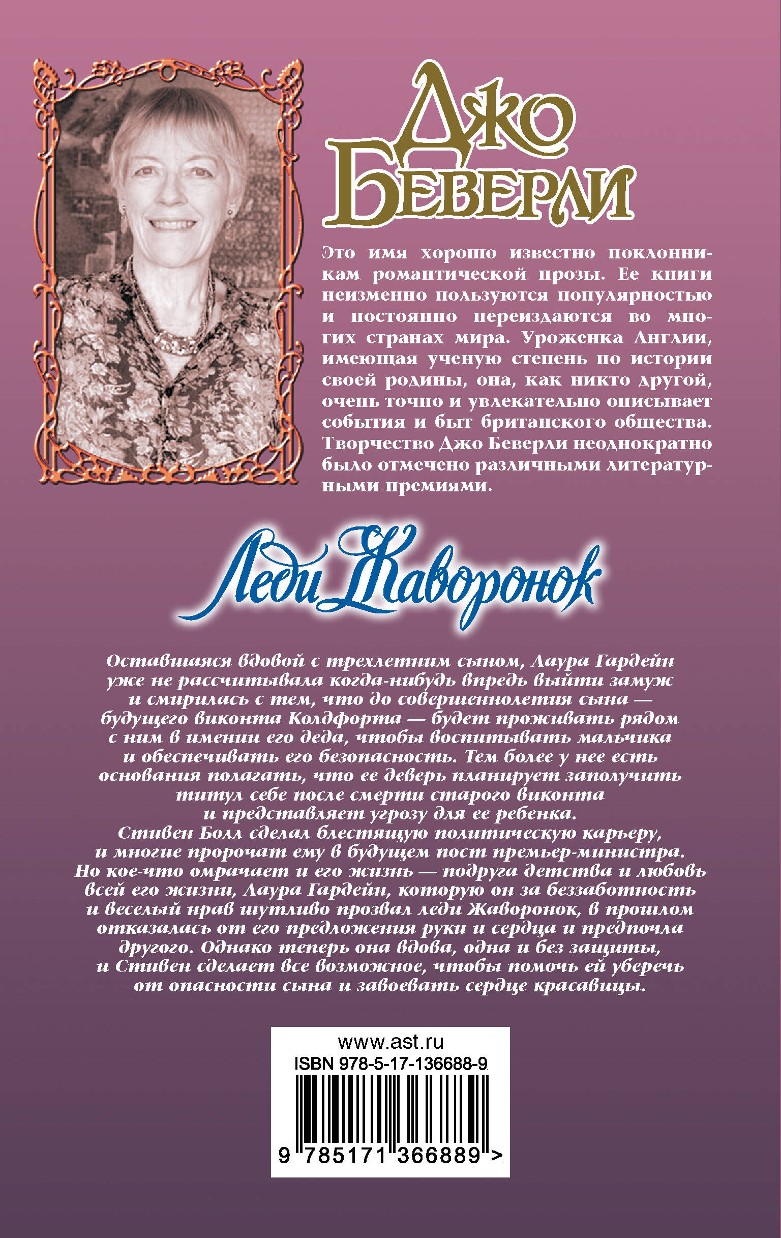 Оставшаяся вдовой с трехлетним сыном, Лаура Гардейн уже не рассчитывала когда-нибудь впредь выйти замуж и смерилась с тем, что до совершеннолетия сына - будущего виконта Колдфорта - будет проживать рядом с ним в имении его деда, чтобы воспитывать мальчика и обеспечивать его безопасность. Тем более у нее есть основания полагать, что ее деверь планирует заполучить титул себе после смерти старого виконта и представляет угрозу для ее ребенка. Стивен Болл сделал блестящую политическую карьеру, и многие пророчат ему в будущем пост премьер-министра. Но кое-что омрачает и его жизнь - подруга детства и любовь всей его жизни, Лаура Гардейн, которую он за беззаботность и веселый нрав шутливо прозвал леди Жаворонок, в прошлом отказалась от его предложения руки и сердца и предпочла другого. Однако теперь она вдова, одна и без защиты, и Стивен сделает все возможное, чтобы помочь ей уберечь от опасности сына и завоевать сердце красавицы.| Издательство | Издательство "АСТ" |