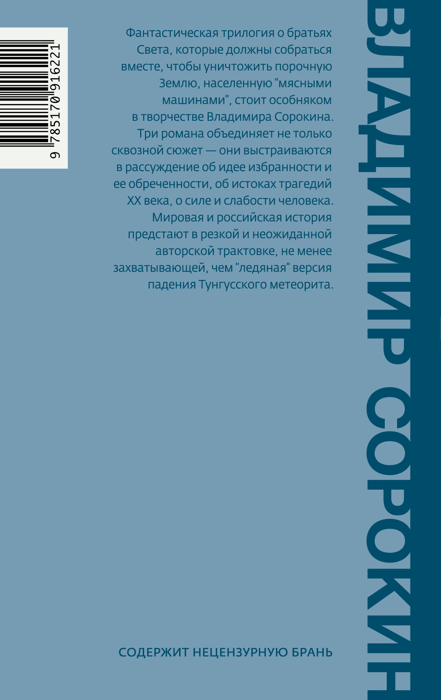 Дети Льда... Они могут общаться друг с другом без слов, они проникли во все страны и во все организации, они хотят уничтожить всех, кто от них отличается. Три ярких, шокирующих и с непревзойденным мастерством написанных романа от одного из главных возмутителей спокойствия в русской литературе. Любое произведение Владимира Сорокина неизбежно вызывает настоящую бурю, причем далеко не только в окололитературных кругах. Его полемические, шокирующие и не признающие никаких рамок романы вызывают самые разные чувства, от восторга и обожания до неприятия и глубочайшего возмущения. И совершенно точно, как бы вы ни относились к творчеству Сорокина, при изучении современной литературы пройти мимо этой трилогии не удастся никак. История о космической субстанции, попавшей на Землю вместе с метеоритом, и о людях, этой субстанцией пробужденных, получилась по-сорокински глубокой, гротескной и полной аллюзий. Здесь и тайный орден сверхлюдей, считающих всех остальных «мясными машинами», и столкновение элитаризма с обществом потребления, и политическая сатира. Высокое соседствует с низким, сакральное с плотским, а границы доступного, как и понятие нормы, максимально размыты. Ну и, конечно, традиционные знаки отличия сорокинской прозы: великолепный стиль, яркие диалоги, захватывающий и совершенно непредсказуемый сюжет, объединяющий все три романа.| Издательство | Издательство "АСТ" |