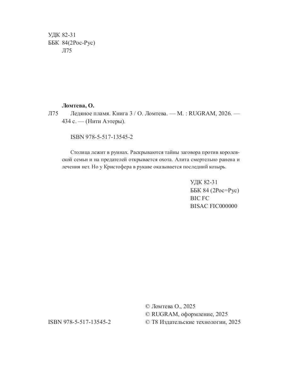 Столица лежит в руинах. Раскрываются тайны заговора против королевской семьи и на предателей открывается охота. Алита смертельно ранена и лечения нет. Но у Кристофера в рукаве оказывается последний козырь.| Издательство | Т8 RUGRAM |