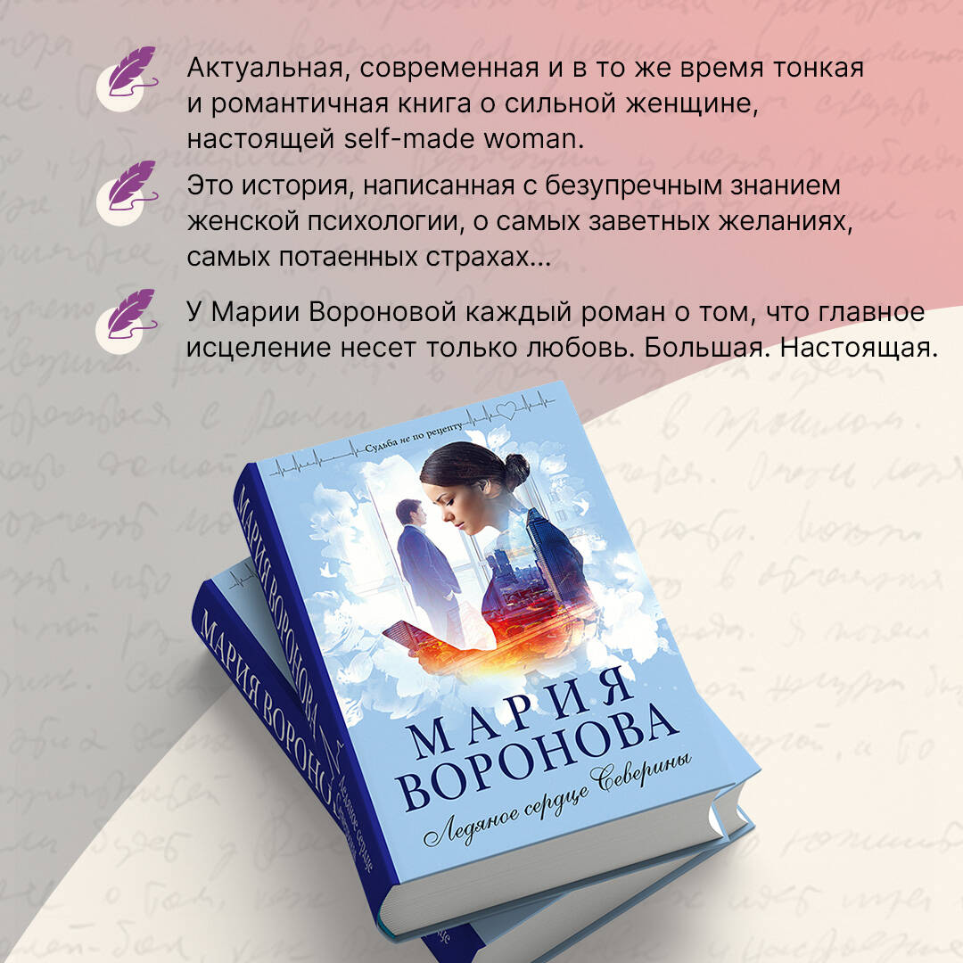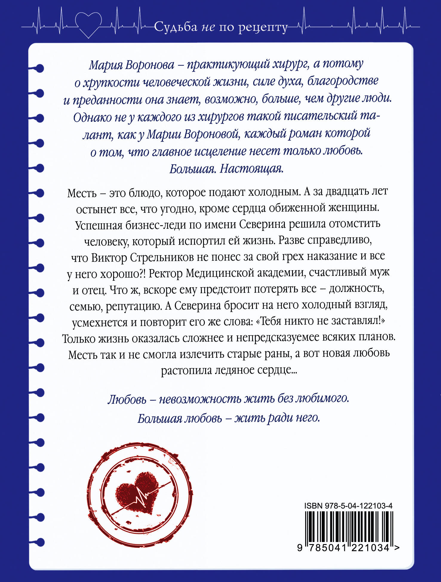 Романы Марии Вороновой переносят читателя в недалекое прошлое, такое сложное и такое родное. Неприкаянные одинокие души ищут любовь и находят ее, несмотря на то что за это великое чувство им приходится бороться. Месть - это блюдо, которое подают холодным. А за двадцать лет остынет все, что угодно, кроме сердца обиженной женщины. Успешная бизнес-леди по имени Северина решила отомстить человеку, который испортил ей жизнь. Разве справедливо, что Виктор Стрельников не понес за свой грех наказание и все у него хорошо?! Ректор Медицинской академии, счастливый муж и отец. Что ж, вскоре ему предстоит потерять все - должность, семью, репутацию. А Северина бросит на него холодный взгляд, усмехнется и повторит его же слова: «Тебя никто не заставлял!» Только жизнь оказалась сложнее и непредсказуемее всяких планов. Месть так и не смогла излечить старые раны, а вот новая любовь растопила ледяное сердце…| Издательство | ООО "Издательство "Эксмо" |
