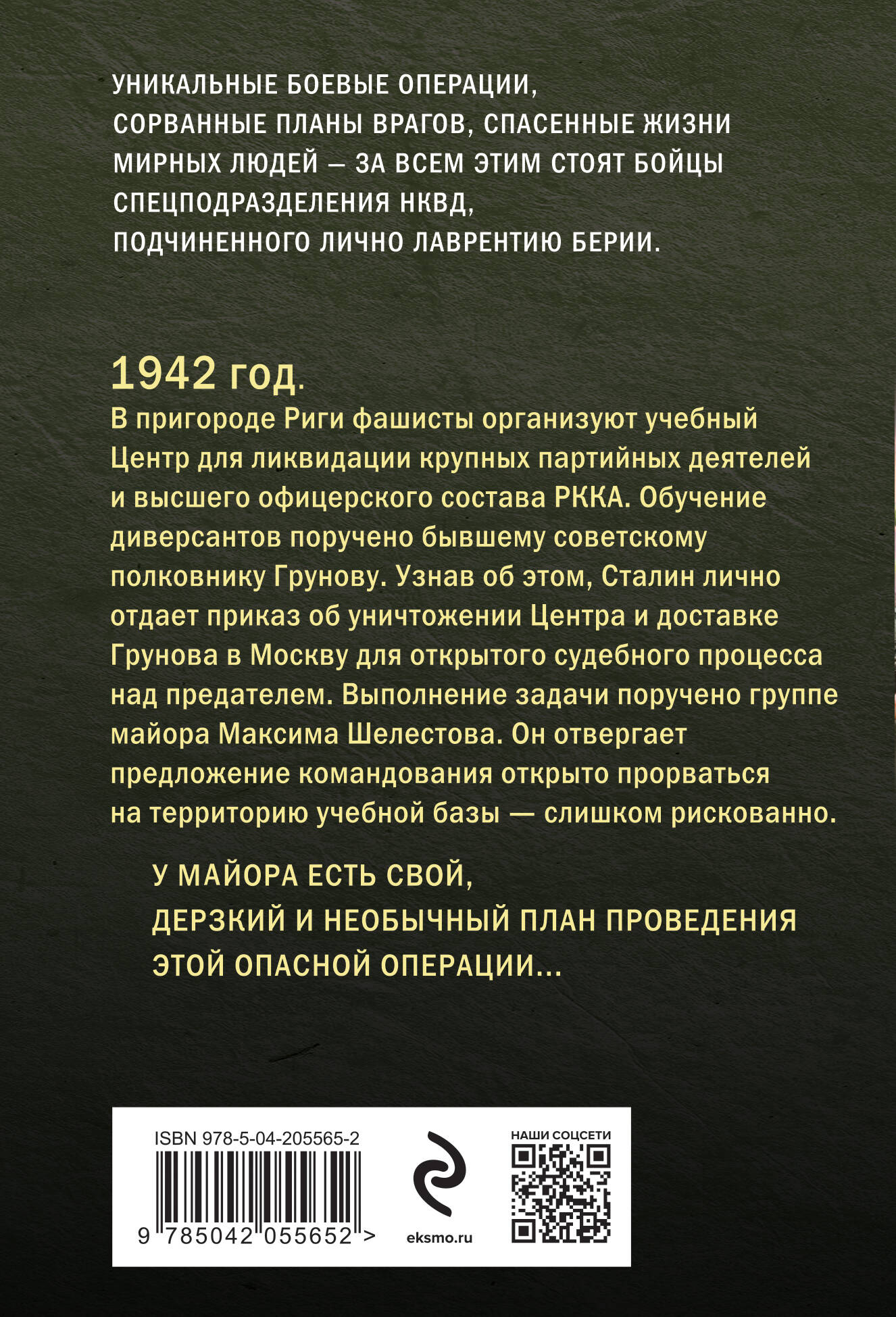 Роман о военном времени, о сложных судьбах и опасной работе неизвестных героев, вошедших в ударный состав «спецназа Берии». 1942 год. В пригороде Риги фашисты организуют учебный Центр для ликвидации крупных партийных деятелей и высшего офицерского состава РККА. Обучение диверсантов поручено бывшему советскому полковнику Грунову. Узнав об этом, Сталин лично отдает приказ об уничтожении Центра и доставке Грунова в Москву для открытого судебного процесса над предателем. Выполнение задачи поручено группе майора Максима Шелестова. Он отвергает предложение командования открыто прорваться на территорию учебной базы - слишком рискованно. У майора есть свой, дерзкий и необычный план проведения этой опасной операции… «Эта серия хороша тем, что в ней проведена верная главная мысль: в НКВД Лаврентия Берии умели верить людям, потому что им умел верить сам нарком. История группы майора Шелестова сходна с реальной историей крупного агента абвера, бывшего штабс-капитана царской армии Нелидова, попавшего на Лубянку в сентябре 1939 года. Тем более вероятными выглядят на фоне истории Нелидова приключения Максима Шелестова и его товарищей, описанные в этом романе». - С. Кремлев Общий тираж книг А. Тамоникова - более 10 миллионов экземпляров.