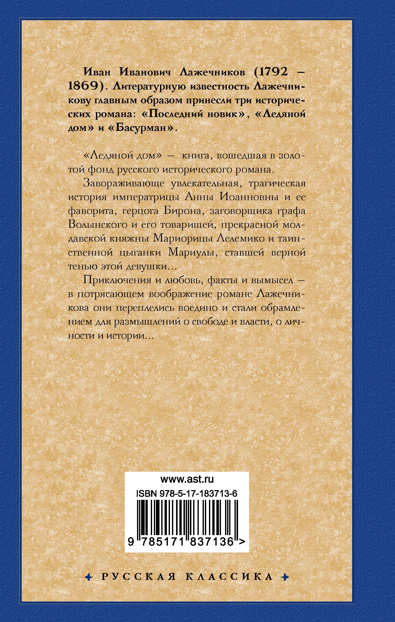 Ледяной дом" - книга, вошедшая в золотой фонд русского исторического романа. Завораживающе увлекательная, трагическая история императрицы Анны Иоанновны и ее фаворита, герцога Бирона, заговорщика графа Волынского и его товарищей, прекрасной молдавской княжны Мариорицы Лелемико и таинственной цыганки Мариулы, ставшей верной тенью этой девушки... Приключения и любовь, факты и вымысел, - в потрясающем воображение романе Лажечникова они переплелись воедино и стали обрамлением для размышлений о свободе и власти, о личности и истории...| Издательство | Издательство "АСТ" |