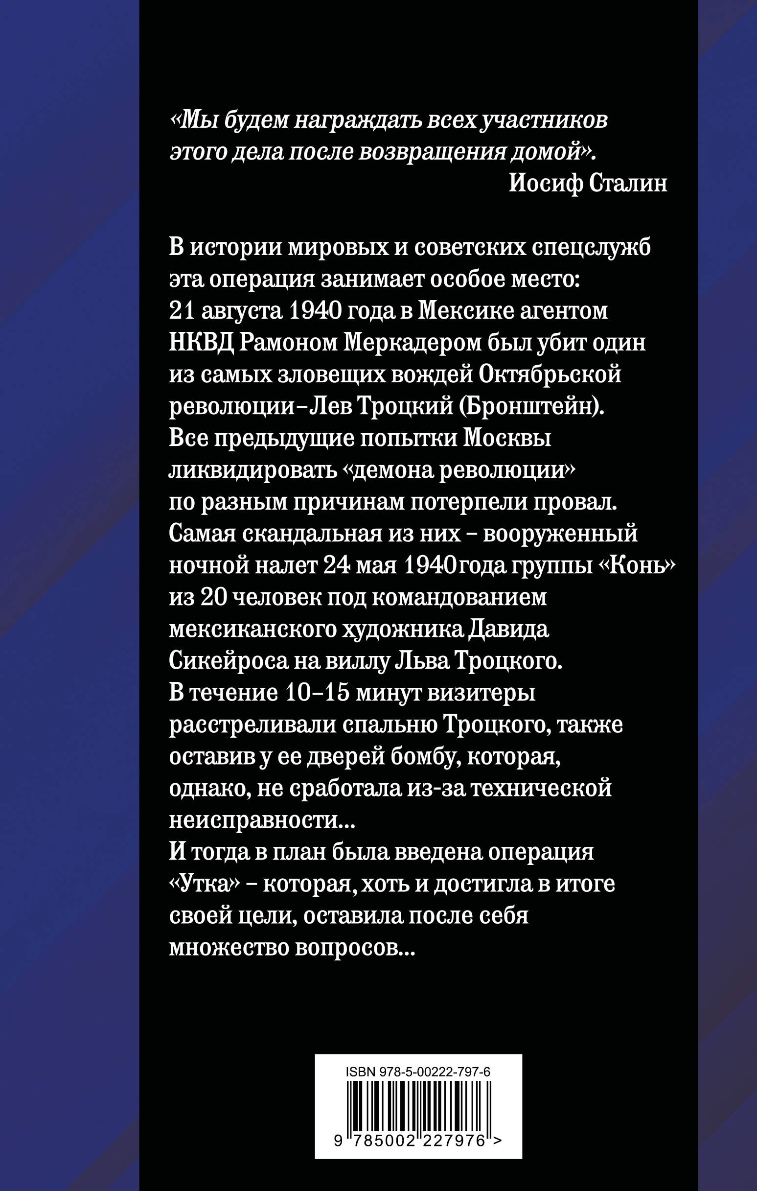 В истории мировых и советских спецслужб эта операция занимает особое место: 21 августа 1940 года в Мексике агентом НКВД Рамоном Меркадером был убит один из самых зловещих вождей Октябрьской революции Лев Троцкий (Бронштейн). Все предыдущие попытки Москвы ликвидировать «демона революции» по разным причинам потерпели провал. Самая скандальная из них - вооруженный ночной налет 24 мая 1940 г. группы «Конь» из 20 человек под командованием мексиканского художника Давида Сикейроса на виллу Льва Троцкого. В течение 10-15 минут визитеры расстреливали спальню Троцкого, также оставив у ее дверей бомбу, которая, однако, не сработала из-за технической неисправности… И тогда в план была введена операция «Утка» - которая хоть и достигла в итоге своей цели, оставила после себя множество вопросов, на которые до сих пор нет однозначных ответов. Руководитель операции Павел Судоплатов и один из исполнителей, Давид Сикейрос, вспоминают подробности ликвидации лидера мирового коммунистического движения Льва Троцкого. Их рассказ дополняют историк спецслужб Александр Колпакиди и эксперт по истории внутрипартийной борьбы и истории левой оппозиции в ВКП(б) Вадим Роговин.| Издательство | Родина Издательство ООО |