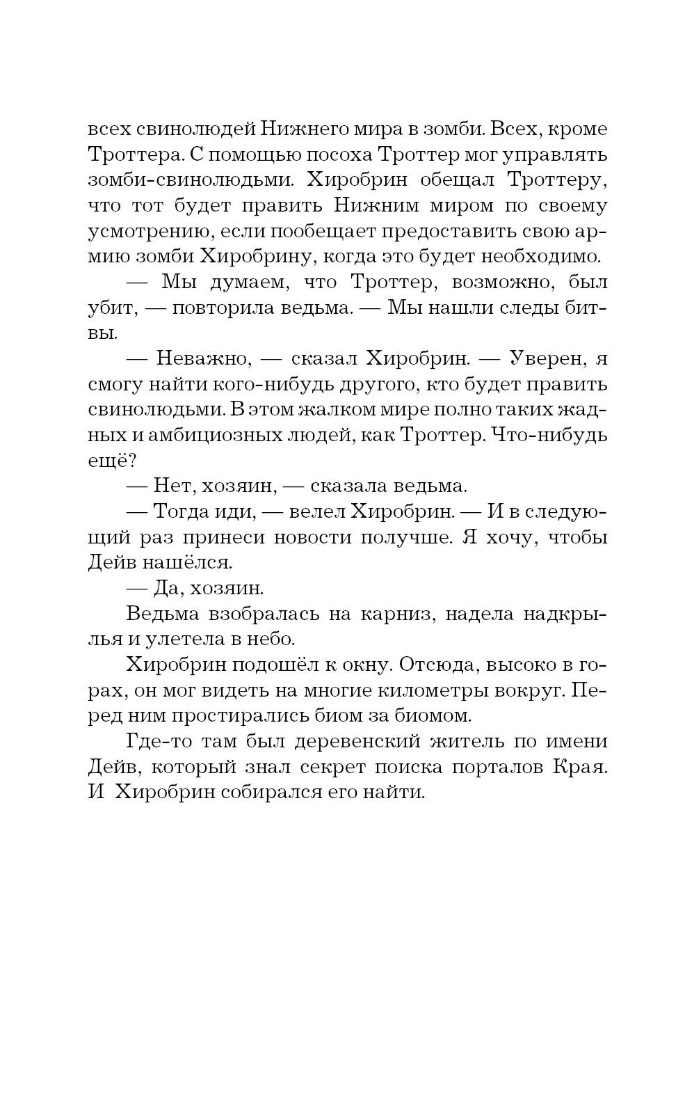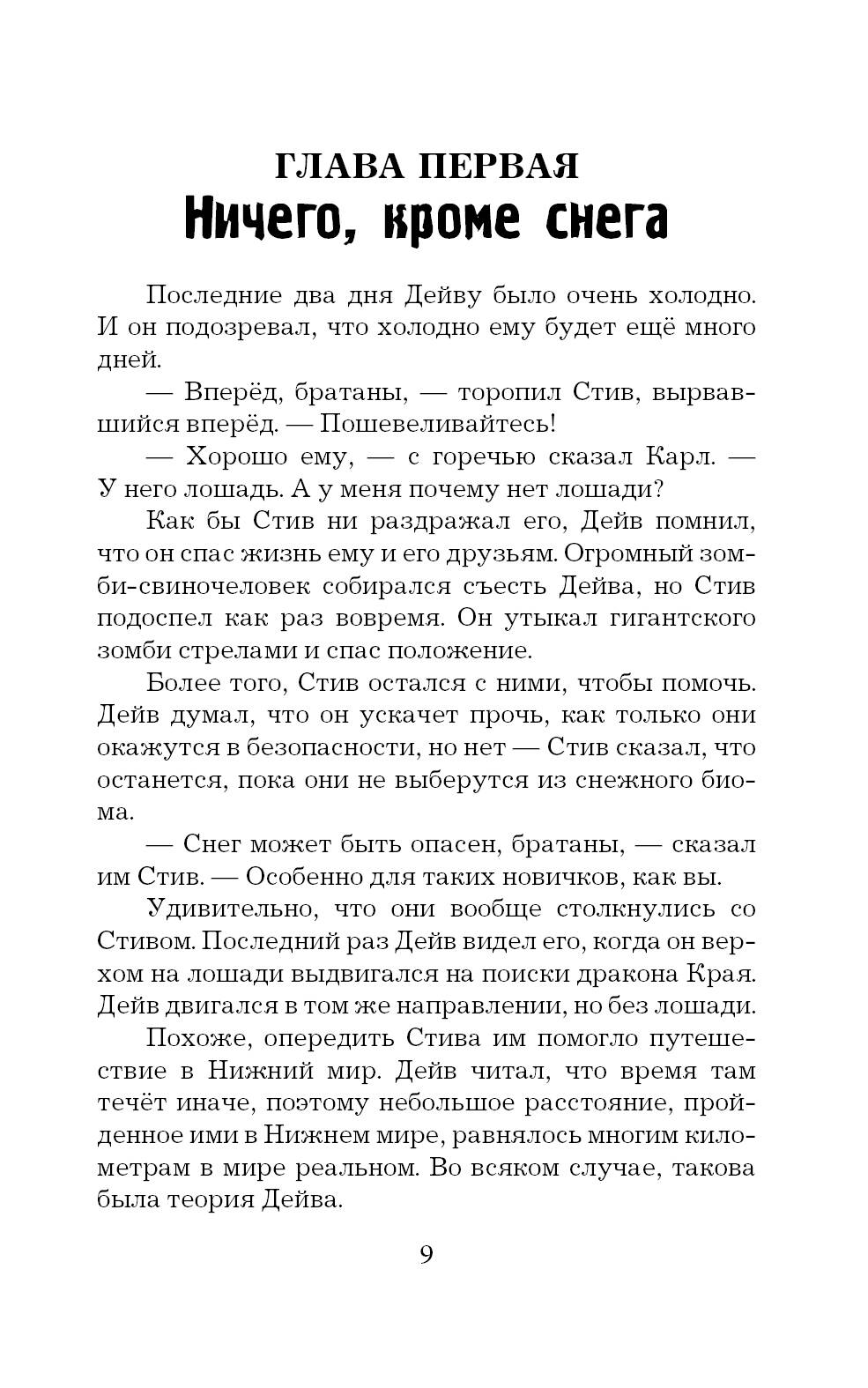 Приключения деревенского жителя Дейва и его друзей продолжаются! Герои движутся к своей цели и намерены во что бы то ни стало попасть в Край и победить дракона. Им придётся пройти через снежные, пустынные и болотные биомы, встретиться со странниками Края, иссушителем и ведьмами. Найти новых друзей и столкнуться со старыми врагами. Герои и злодеи, гасты и ифриты, зомби и криперы, Стив и Хиробрин - все знакомые персонажи встретятся на страницах этой невероятной серии. Сюжет держит в напряжении до последней страницы, а весёлые шутки и запоминающиеся персонажи делают это издание лучшим подарком для фанатов игры.| Издательство | ИЗДАТЕЛЬСТВО "АСТ" |