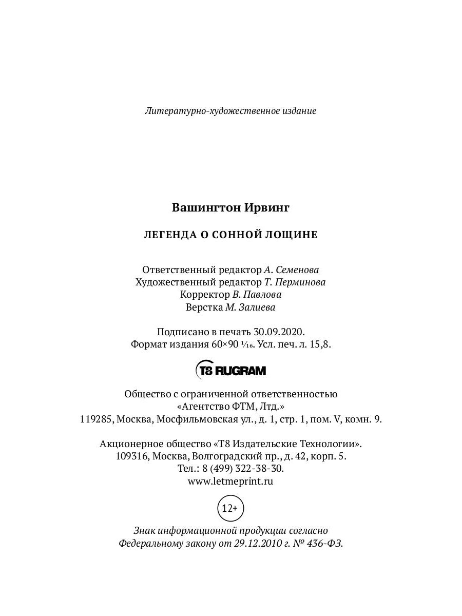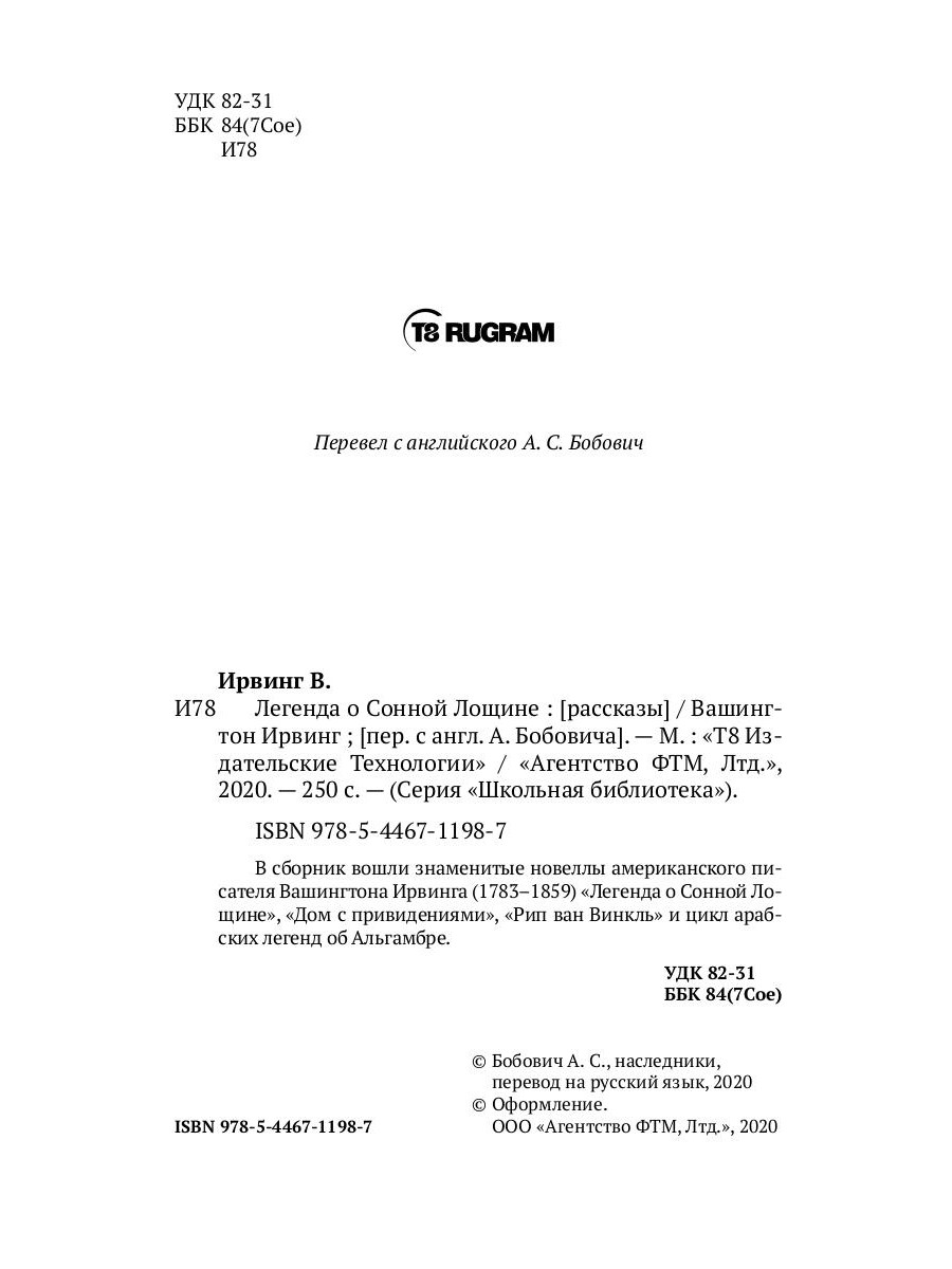 В сборник вошли знаменитые новеллы американского писателя Вашингтона Ирвинга (1783-1859) «Легенда о Сонной Лощине», «Дом с привидениями», «Рип ван Винкль» и цикл арабских легенд об Альгамбре.| Издательство | Т8 RUGRAM |