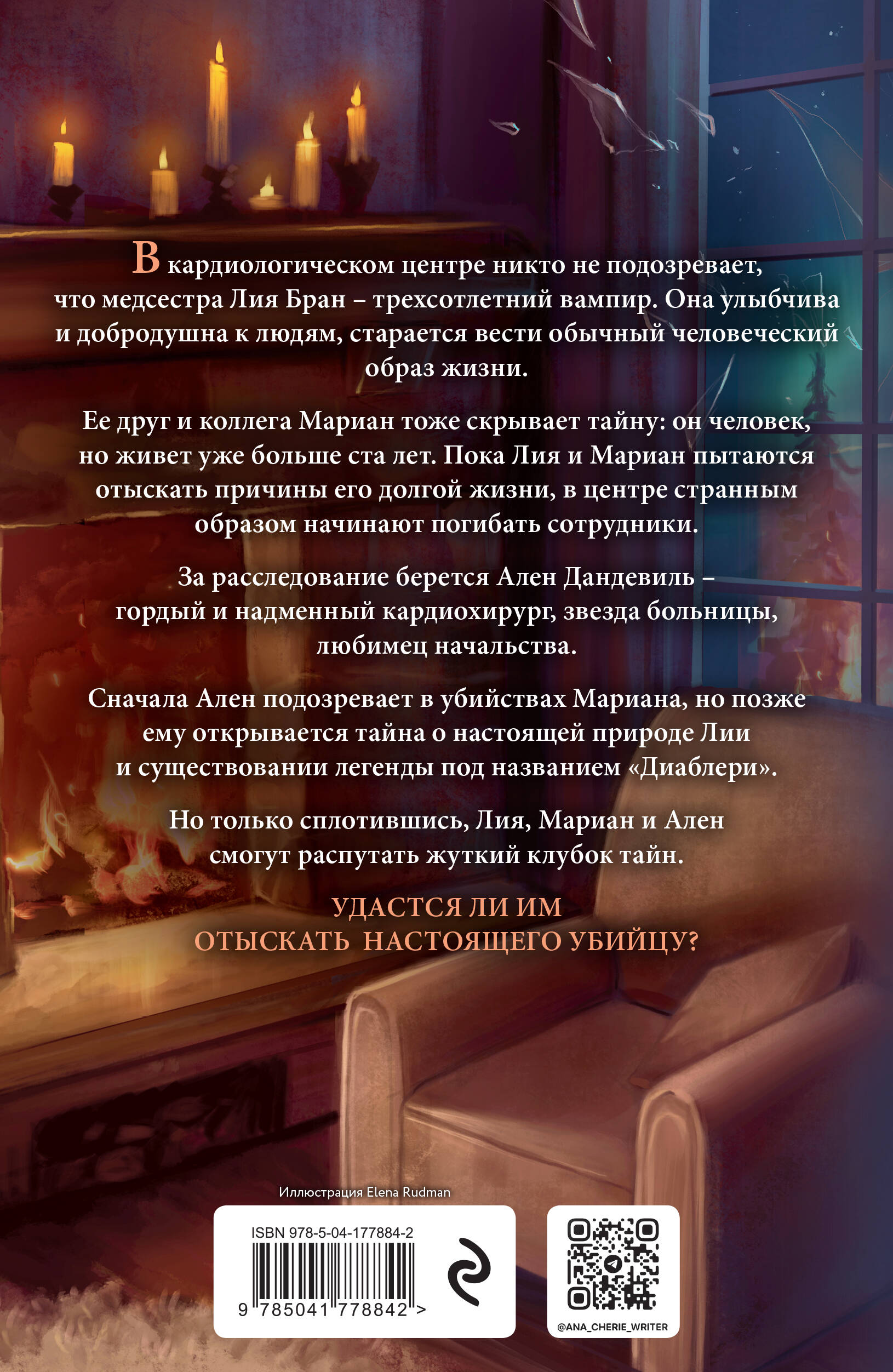 Новинка от Аны Шерри - автора бестселлеров «Хрупкое равновесие», «Я подарю тебе крылья», «Бисцион». Чувственная любовная линия, вампиры в декорациях маленького заснеженного городка, интригующая легенда «Диаблери» и череда загадочных убийств. Что ждет героев на этом извилистом пути к правде? Иллюстрация на обложке: Elena Rudman. В кардиологическом центре никто не подозревает, что медсестра Лия Бран - трехсотлетний вампир. Она улыбчива и добродушна, старается вести обычный человеческий образ жизни. Ее друг и коллега Мариан тоже скрывает тайну: он человек, но живет уже больше ста лет. Пока Лия и Мариан пытаются отыскать причины его долгой жизни, в центре странным образом начинают погибать сотрудники. За расследование берется Ален Дандевиль - гордый и надменный кардиохирург, звезда больницы, любимец начальства. Сначала Ален подозревает в убийствах Мариана, но позже ему открывается тайна о настоящей природе Лии и существовании легенды под названием «Диаблери». Но только сплотившись Лия, Мариан и Ален смогут распутать жуткий клубок тайн. Удастся ли им отыскать настоящего убийцу? «Круговорот событий вовлекает с первых строк. Харизматичные герои пленят чувством юмора и всепоглощающей страстью друг к другу. Каково проявление истинной любви? Какие тайны скрывает далекое прошлое? Читаешь с замиранием сердца, пытаясь расплести клубок интриг и загадок». - Алина, автор блога «Девушка со страниц книг» Об авторе: Ана Шерри - звезда российской сентиментальной прозы, автор бестселлеров «Хрупкое равновесие», «Я подарю тебе крылья», «Бисцион». Ана обладает особым талантом преподносить историю увлекательно и захватывающе, ловко экспериментирует с жанрами, придумывает харизматичных персонажей, которые надолго запоминаются читателям. Читайте бестселлеры Аны Шерри! Цикл «Одно небо на двоих»: 1. «Я подарю тебе крылья. Книга 1» 2. «Я подарю тебе крылья. Книга 2» 3. «Одно небо на двоих» 4. «Ла Элиза» Цикл «Хрупкое равновесие»: 1. «Хрупкое равновесие. Книга 1» 2. «Хрупкое равновесие. Книга 2» 3. «Хрупкое равновесие. Книга 3. Статус-кво» Дилогия «Грация королевы небес»: 1. «Грация королевы небес: тайна Марко» 2. «Грация королевы небес: тайна Адель» Дилогия «Бисцион»: 1. «Бисцион. Книга 1» 2. «Бисцион. Книга 2»| Издательство | ООО "Издательство "Эксмо" |