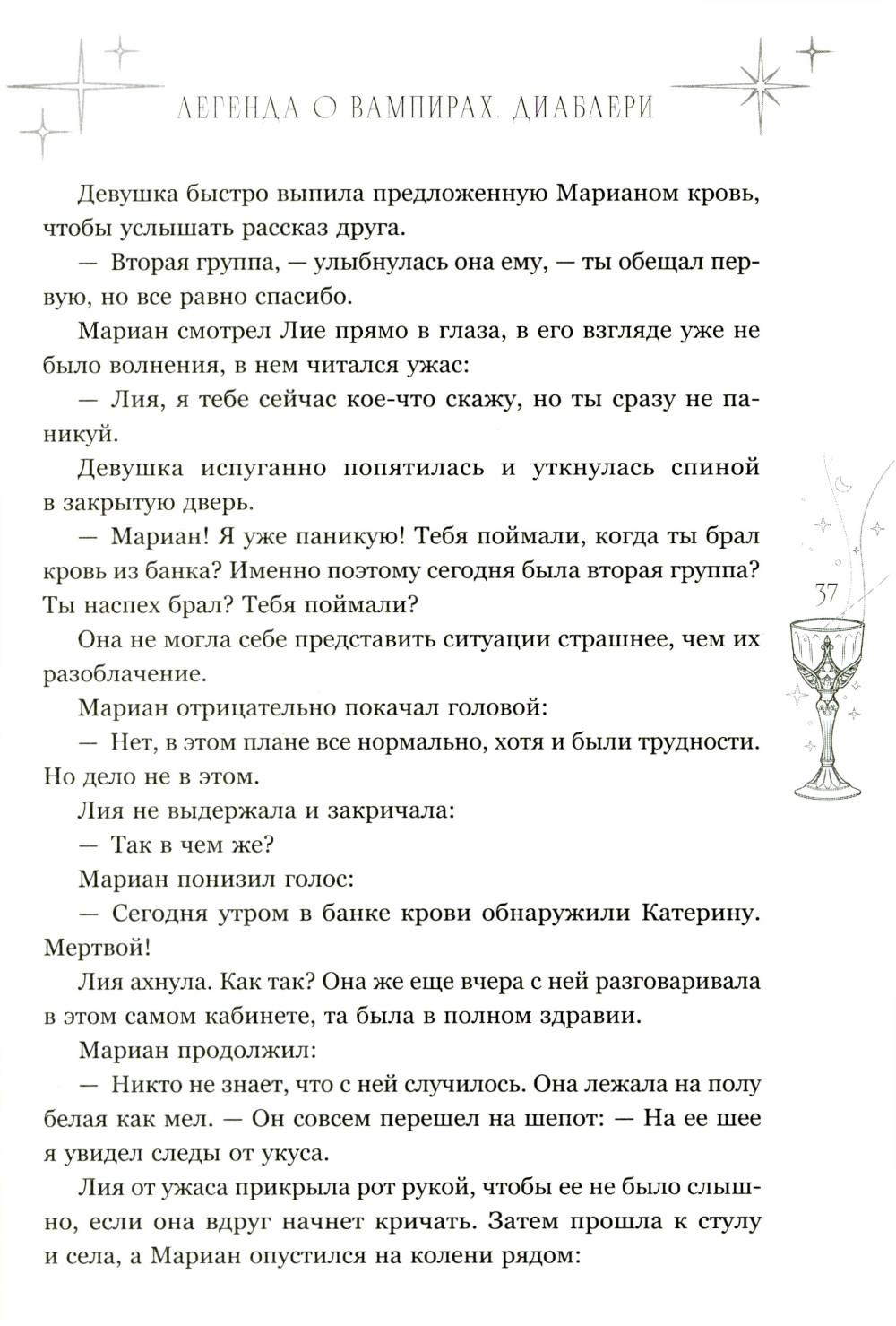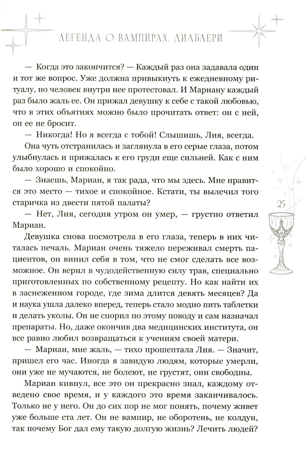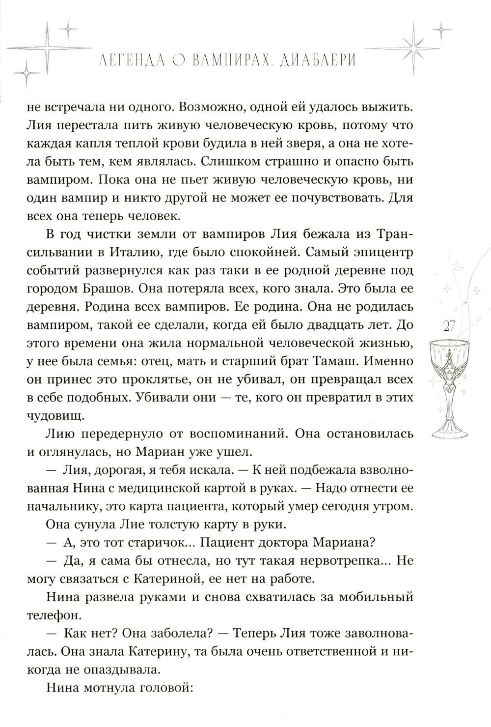В кардиологическом центре никто не подозревает, что медсестра Лия Бран - трехсотлетний вампир. Она улыбчива и добродушна к людям, старается вести обычный человеческий образ жизни. Ее друг и коллега Мариан тоже скрывает тайну: он человек, но живет уже больше ста лет. Пока Лия и Мариан пытаются отыскать причины его долгой жизни, в центре странным образом начинают погибать сотрудники. За расследование берется Ален Дандевиль - гордый и надменный кардиохирург, звезда больницы, любимец начальства. Сначала Ален подозревает в убийствах Мариана, но позже ему открывается тайна о настоящей природе Лии и существовании легенды под названием «Диаблери». Но только сплотившись Лия, Мариан и Ален смогут распутать жуткий клубок тайн. Удастся ли им отыскать настоящего убийцу?| Издательство | Эксмо |