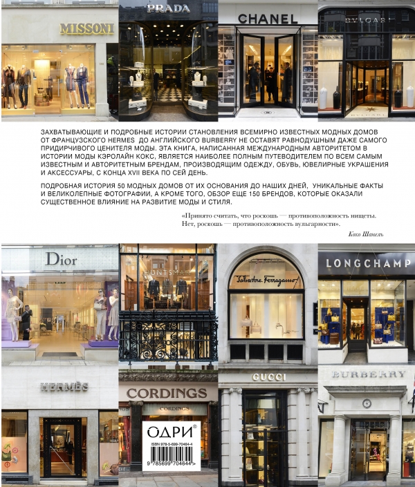 Эта книга - рассказ о самых авторитетных и знаменитых брендах, которые оказали влияние на развитие моды и культуры в целом, таких как Hermes, Louis Vuitton, Chanel, Dior, Gucci, Cartier, Павловский посад и многих других. Она состоит из двух частей. В первой вы найдете подробнейшее описание более чем 50 самых значимых модных Домов - от рождения их основателей, создания первых шедевров до достижения успеха и мирового признания. Вторая часть содержит краткий обзор еще 150 брендов, внесших свой вклад в историю моды и стиля.