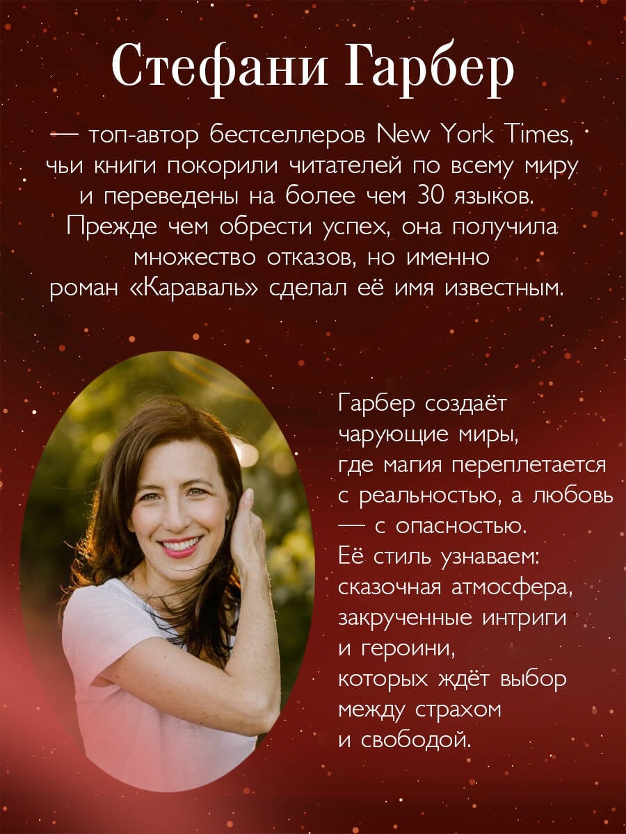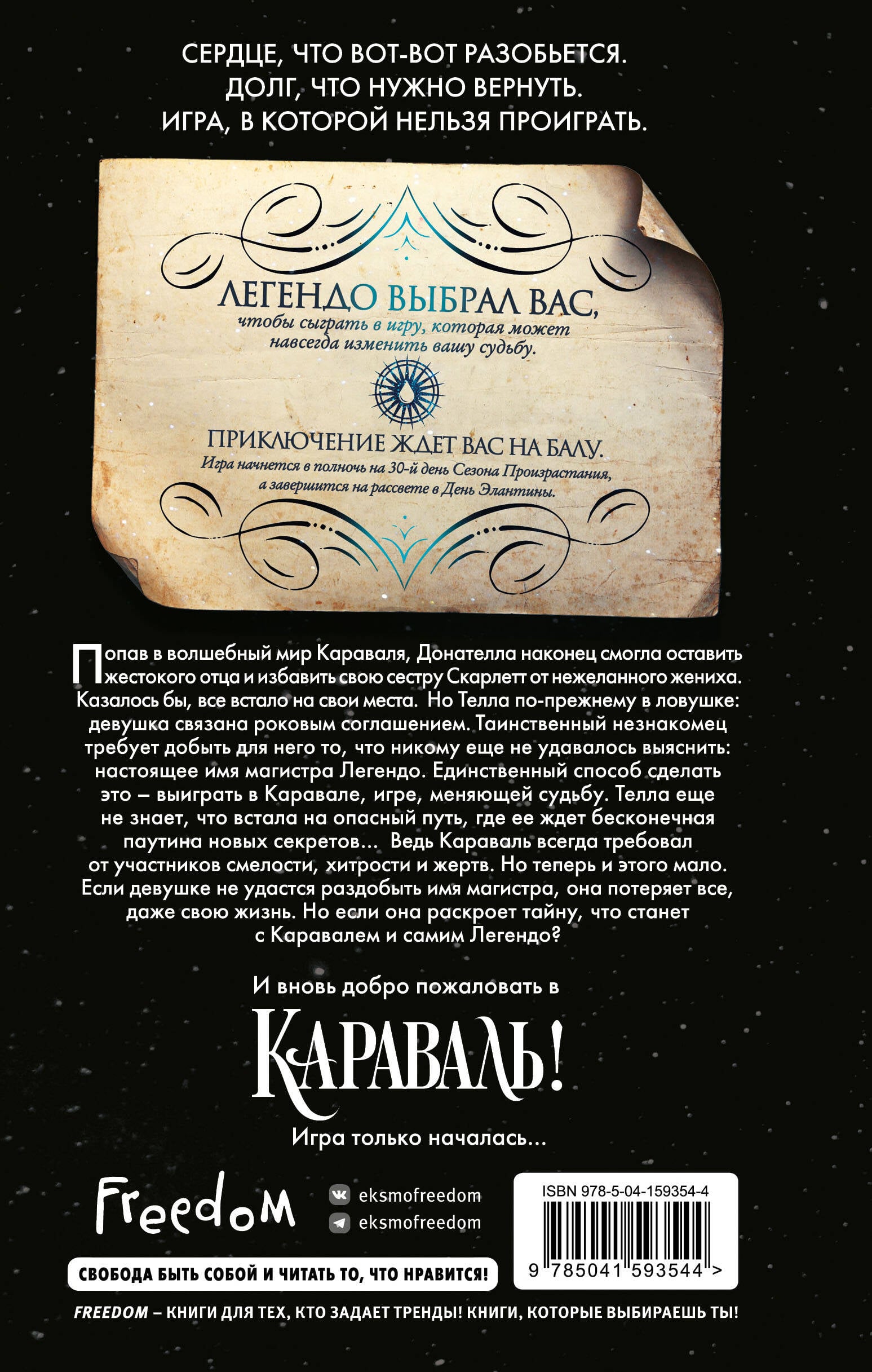 Cердце, что вот-вот разобьется. Долг, что нужно вернуть. Игра, в которой нельзя проиграть. Попав в волшебный мир Караваля, Донателла, наконец, смогла оставить жестокого отца и избавить свою сестру Скарлетт от нежеланного жениха. Казалось бы, все встало на свои места. Но Телла по-прежнему в ловушке: девушка связана роковым соглашением. Таинственный незнакомец требует добыть для него то, что никому еще не удавалось выяснить: настоящее имя магистра Легендо. Единственный способ сделать это - выиграть в Каравале, игре, меняющей судьбу. Телла еще не знает, что встала на опасный путь, где ее ждет бесконечная паутина новых секретов… Ведь Караваль всегда требовал от участников смелости, хитрости и жертв. Но теперь и этого мало. Если девушке не удастся раздобыть имя магистра, она потеряет всё, даже свою жизнь. Но если она раскроет тайну, что станет с Каравалем и самим Легендо? И вновь добро пожаловать в КАРАВАЛЬ! Игра только началась… Стефани Гарбер - топ-автор бестселлеров New York Times с мировым успехом! Ее книги переведены более чем на 30 языков! Стефани - фанат Диснейленда, для нее это единственное место на Земле, где фантастические явления становятся реальностью. Истории писательницы нельзя пропустить - уникальное сочетание магии и таинственного сеттинга. Потрясающее мрачно-завораживающее фэнтези. Продолжение культовой истории о Каравале - мире грез и иллюзий, воплотившихся в реальность. В этой книге главной героиней выступает сестра Скарлетт, Телла, которой предстоит сделать невыполнимое: узнать настоящее имя самого магистра Караваля! Девушке придется вновь пробраться на шоу и выяснить еще больше тайн… Но кто знает, сможет ли Телла принять правду, когда она ей откроется? Трилогия о Каравале вошла в ТОП-10 лучших историй YA. Впервые выходит в оригинальных обложках! Уникальная история о двух сестрах, которые были втянуты в опасную интригу легендарной игры. Риск, магия, любовь на грани безумия! Первая книга стала настоящим хитом: № 1 по версии книжного портала IndieNext Pick, лучшая YA книга 2017 года по версии Entertainment Weekly, Teen Vogue, BuzzFeed, Barnes & Noble. Серия побила рекорды по количеству отзывов: более 10 тыс. отзывов на Amazon.com и полмиллиона оценок на Goodreads.com! Магия, коварство, ложь, риск. Караваль реагирует на твои эмоции. Не теряй самоконтроль, иначе погибнешь! Будь осторожен. Ничего не принимай на веру!| Издательство | ООО "Издательство "Эксмо" |