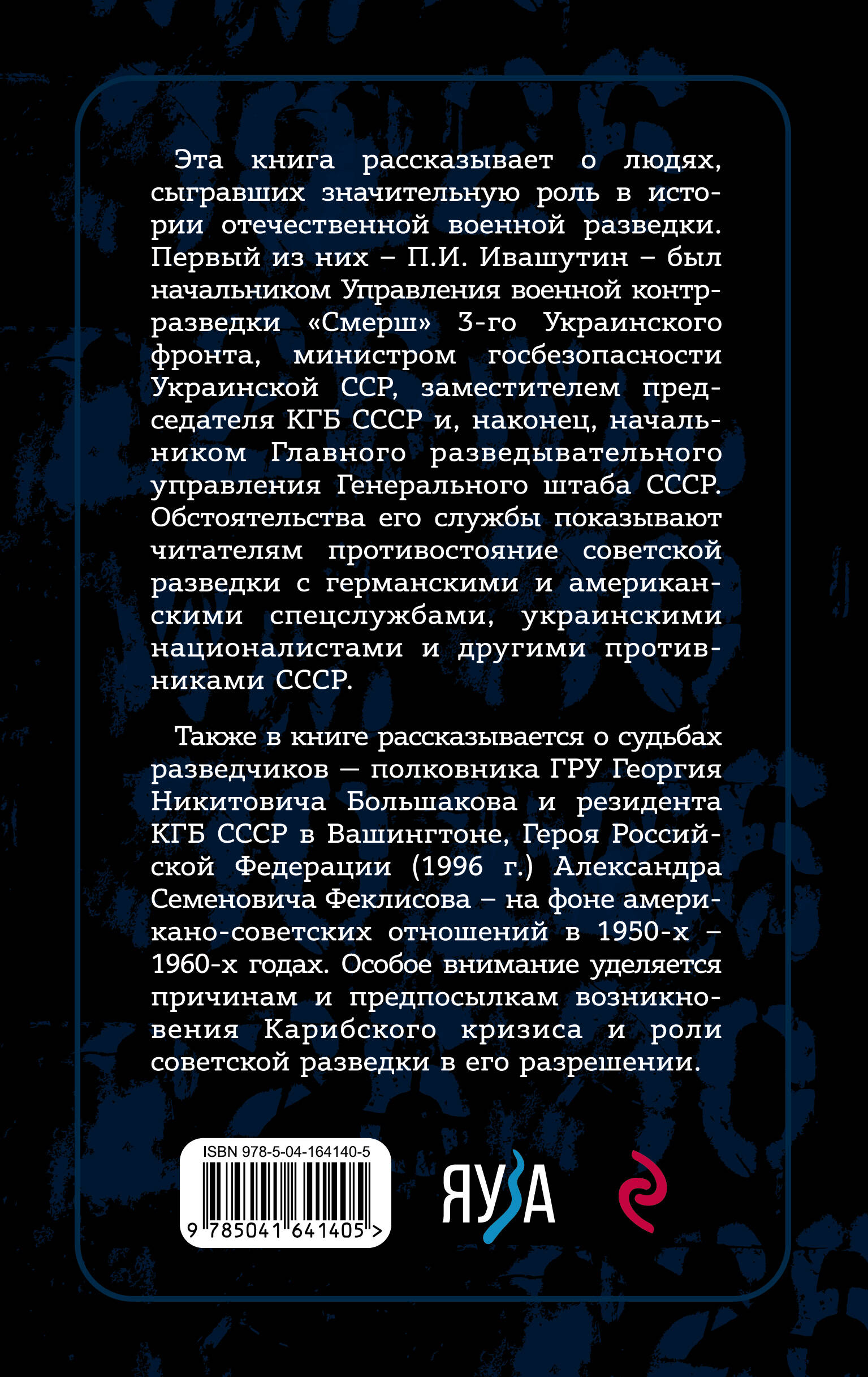 Эта книга рассказывает о людях, сыгравших значительную роль в истории отечественной военной разведки. Первый из них, П.И. Ивашутин, был начальником Управления военной контрразведки «Смерш» 3-го Украинского фронта, министром Госбезопасности Украинской СССР, заместителем председателя КГБ СССР и, наконец, начальником Главного разведывательного управления Генерального штаба СССР. Обстоятельства его службы показывают читателям противостояние советской разведки с германскими и американскими спецслужбами, украинскими националистами и другими противниками СССР. Также в книге рассказывается о судьбах разведчиков - полковника ГРУ Георгия Никитовича Большакова и резидента КГБ СССР в Вашингтоне, Героя Российской Федерации (1996 г.) Александра Семеновича Феклисова, на фоне американо-советских отношений 1950-х - 1960-х годов. Особое внимание уделяется причинам и предпосылкам возникновения Карибского кризиса и роли советской разведки в его разрешении.| Издательство | Эксмо |