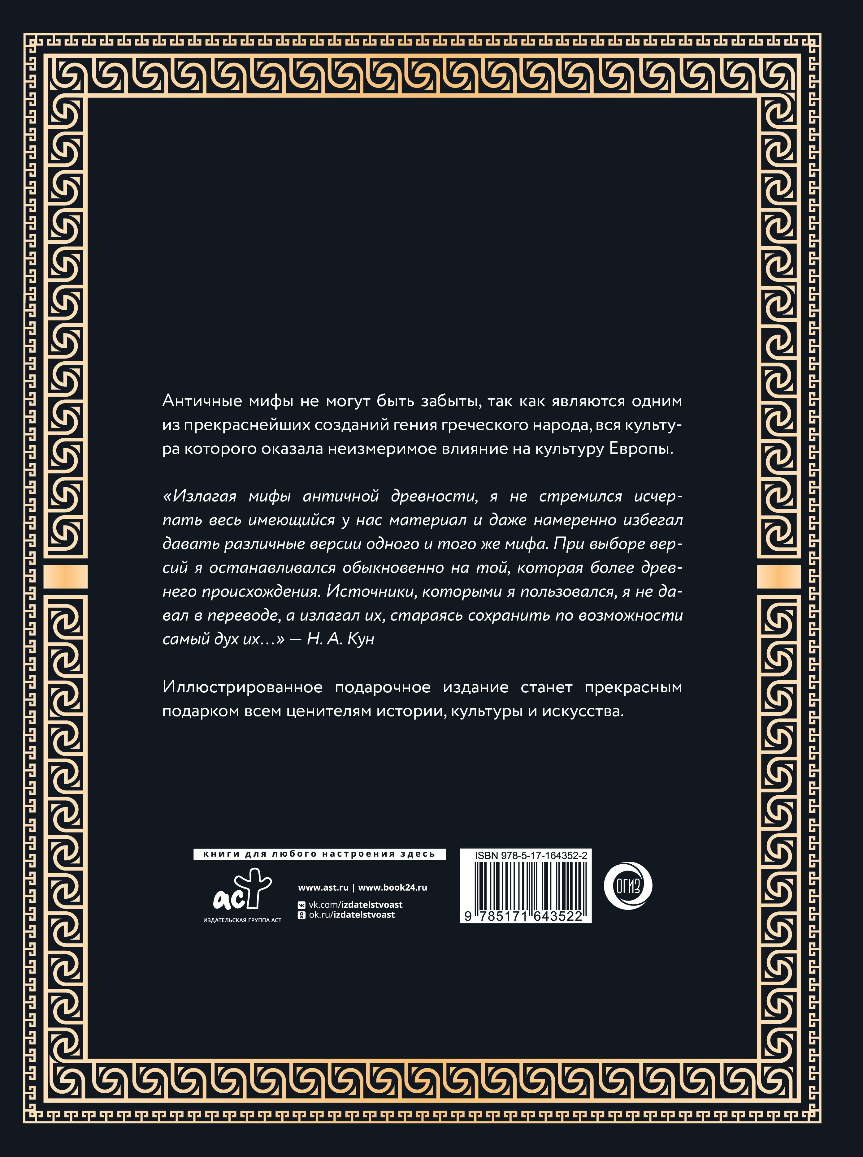 Античные мифы не могут быть забыты, так как являются одним из прекраснейших созданий гения греческого народа, вся культура которого оказала неизмеримое влияние на культуру Европы. "Излагая мифы античной древности, я не стремился исчерпать весь имеющийся у нас материал и даже намеренно избегал давать различные версии одного и того же мифа. При выборе версий я останавливался обыкновенно на той, которая более древнего происхождения. Источники, которыми я пользовался, я не давал в переводе, а излагал их, стараясь сохранить по возможности самый дух их…" - Н. А. Кун Иллюстрированное подарочное издание станет прекрасным подарком всем ценителям истории, культуры и искусства.| Издательство | Издательство "АСТ" |