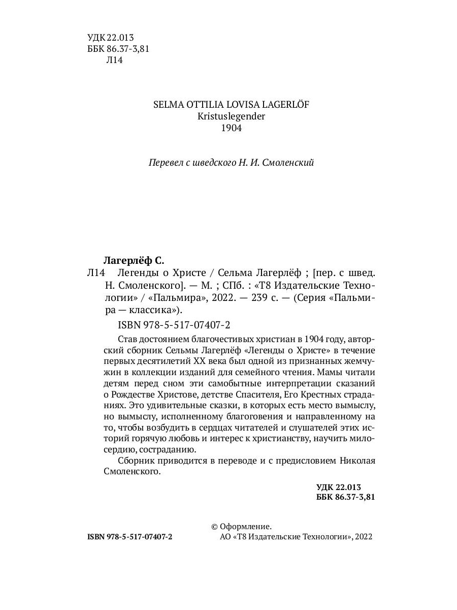 Став достоянием благочестивых христиан в 1904 году, авторский сборник Сельмы Лагерлёф "Легенды о Христе" в течение первых десятилетий XX века был одной из признанных жемчужин в коллекции изданий для семейного чтения. Мамы читали детям перед сном эти самобытные интерпретации сказаний о Рождестве Христове, детстве Спасителя, Его Крестных страданиях. Это удивительные сказки, в которых есть место вымыслу, по вымыслу, исполненному благоговения и направленному на то, чтобы возбудить в сердцах читателей и слушателей этих историй горячую любовь и интерес к христианству, научить милосердию, состраданию. Сборник приводится в переводе и с предисловием Николая Смоленского.