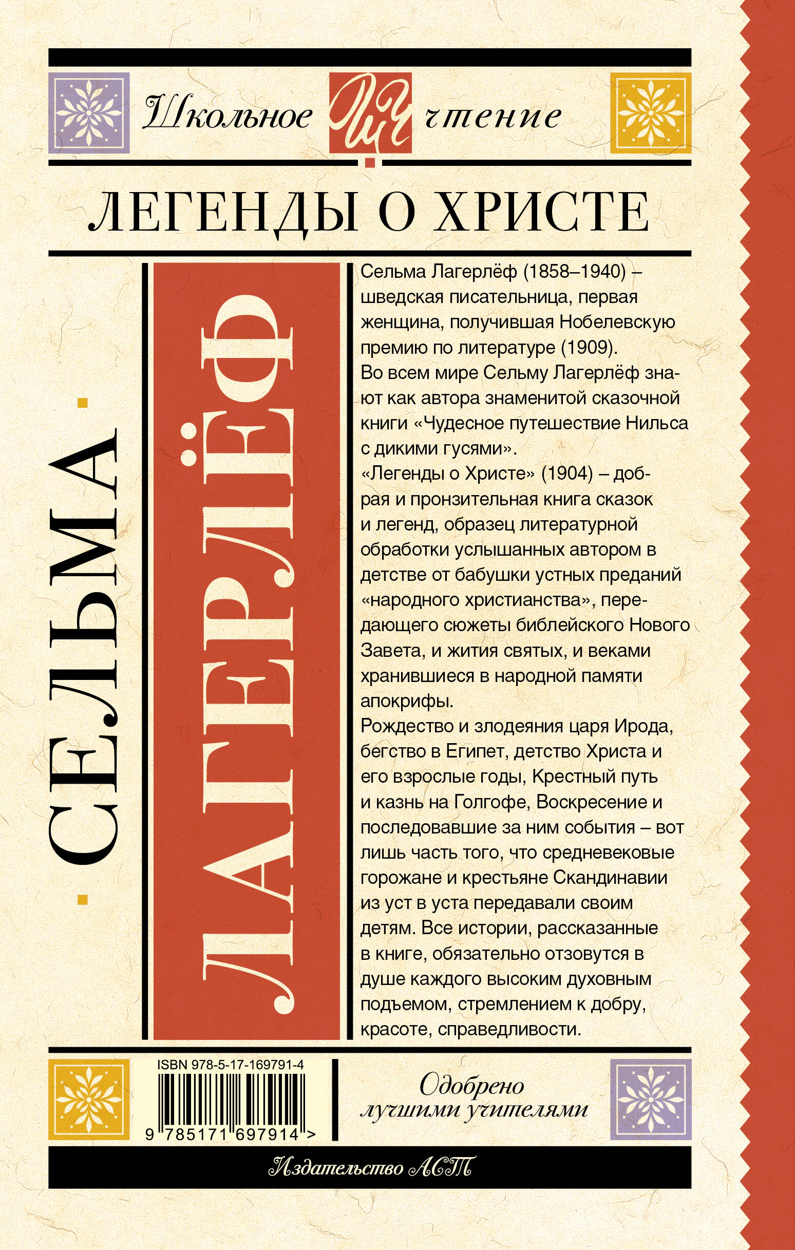 Сельма Лагерлёф (1858-1940) - шведская писательница, первая женщина, получившая Нобелевскую премию по литературе (1909). Во всем мире Сельму Лагерлёф знают, как автора знаменитой сказочной книги "Чудесное путешествие Нильса с дикими гусями". "Легенды о Христе" (19094) - добрая и пронзительная книга сказок и легенд - образец литературной обработки услышанных автором в детстве от бабушки устных преданий "народного христианства", передающего сюжеты библейского Нового Завета, и жития святых, и веками хранившиеся в народной памяти апокрифы. Рождество и злодеяния царя Ирода, бегство в Египет, детство Христа и его взрослые годы, Крестный путь и казнь на Голгофе, Воскресение и последовавшие за ним события - вот лишь часть того, что средневековые горожане и крестьяне Скандинавии из уст в уста передавали своим детям. Все истории, рассказанные в книге, обязательно отзовутся в душе каждого высоким духовным подъемом, стремлением к добру, красоте, справедливости.