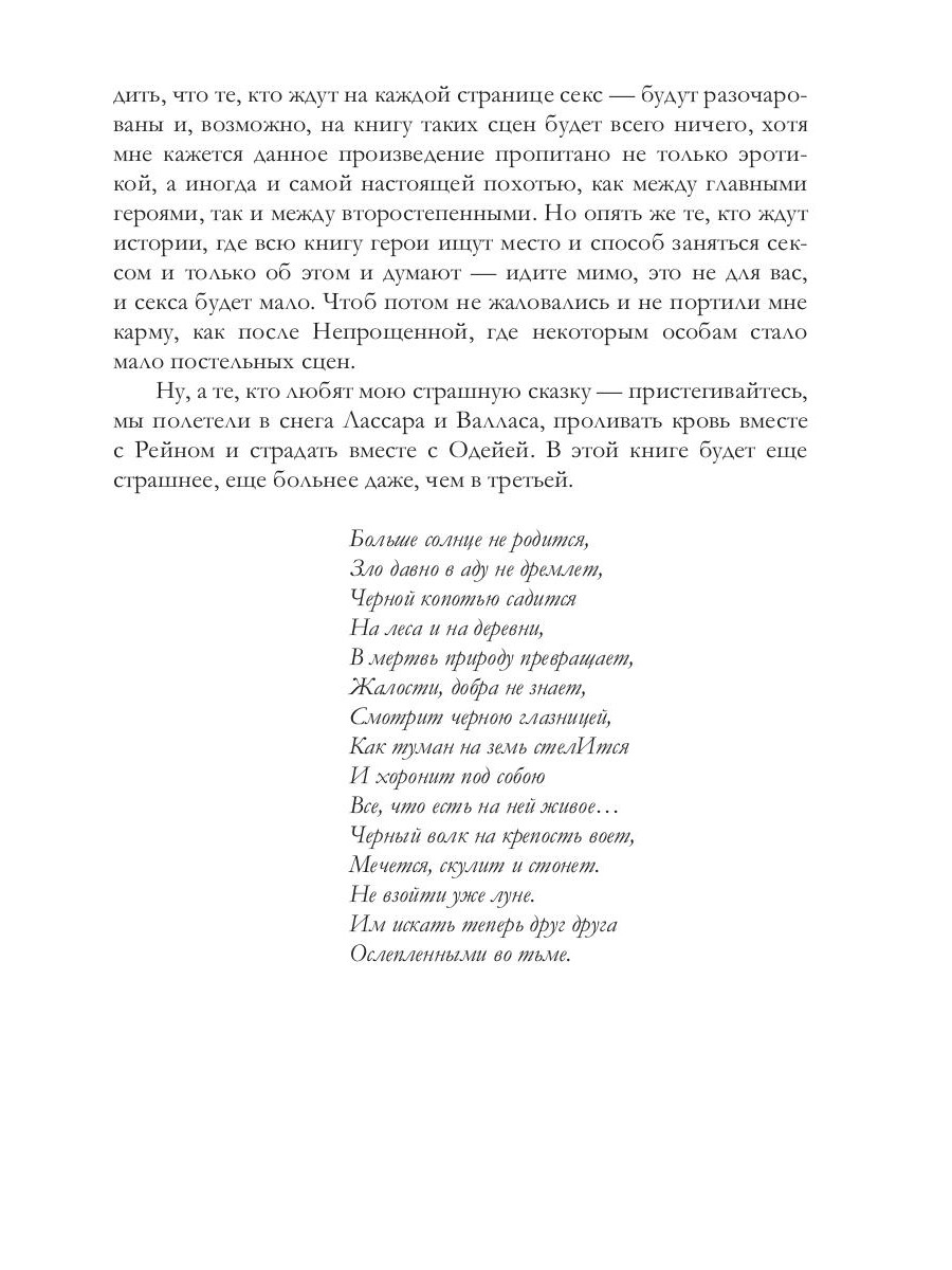 Не так страшна война с людьми… как страшна война с нелюдью. Переполнилась земля кровью и болью, дала нажраться плотью злу первобытному, голодному. Мрак опустился, нет ни одного луча света, утро уже не наступит никогда. Вечная ночь. Даже враги затаились от ужаса перед неизвестностью, и войны стихли. Замер род людской и убоялся иных сил. Стонет в крепости женщина с красными волосами, отданная другому, ждет своего зверя лютого. Пусть придет и заберет ее душу с собой в вечную темноту.| Издательство | Т8 RUGRAM |