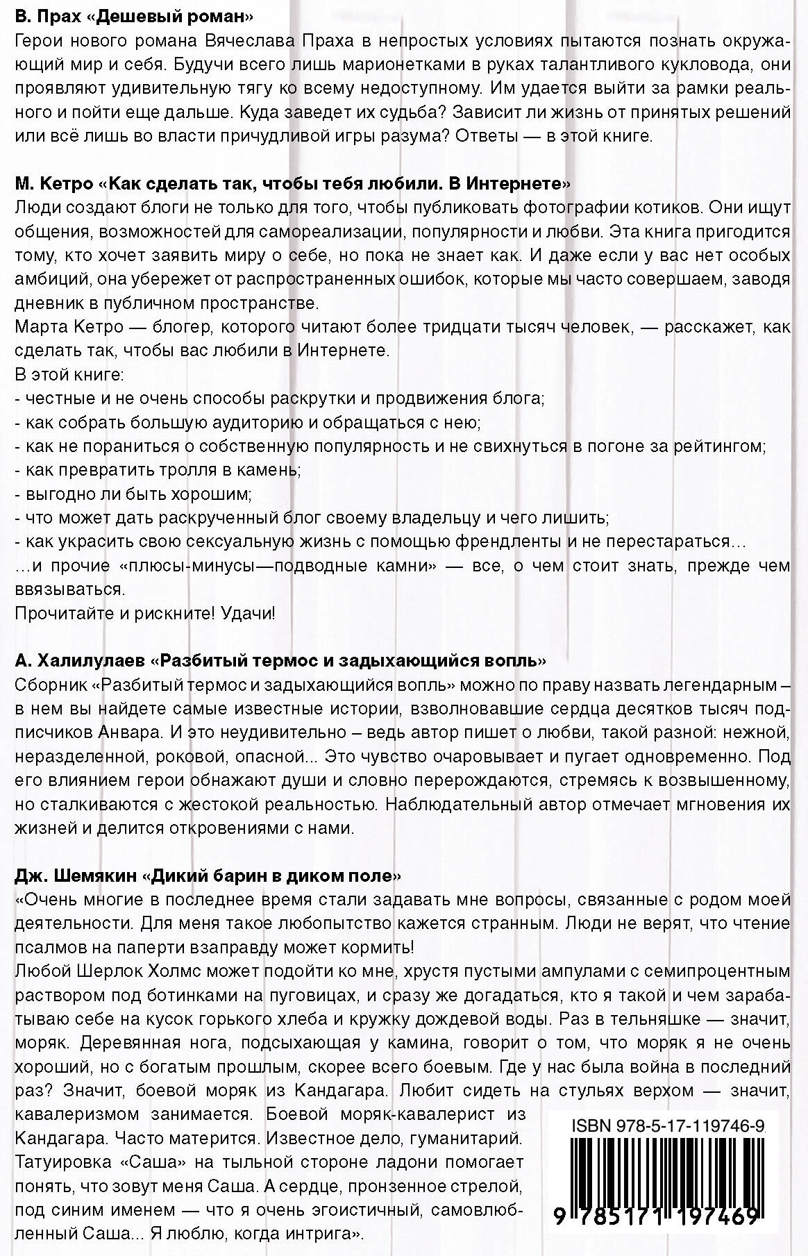 Легенды Рунета (комплект из 4 книг): 1. В. Прах "Дешевый роман" Герои нового романа Вячеслава Праха в непростых условиях пытаются познать окружающий мир и себя. Будучи всего лишь марионетками в руках талантливого кукловода, они проявляют удивительную тягу ко всему недоступному. Им удается выйти за рамки реального и пойти еще дальше. Куда заведёт их судьба? Зависит ли жизнь от принятых решений, или всё лишь во власти причудливой игры разума? Ответы - в этой книге. 2. М. Кетро "Как сделать так, чтобы тебя любили" Люди создают блоги не только для того, чтобы публиковать фотографии котиков. Они ищут общения, возможностей для самореализации, популярности и любви. Эта книга пригодится тому, кто хочет заявить миру о себе, но пока не знает, как. И даже если у вас нет особых амбиций, она убережёт от распространённых ошибок, которые мы часто совершаем, заводя дневник в публичном пространстве. Марта Кетро - блогер, которого читают более тридцати тысяч человек, - расскажет, как сделать так, чтобы вас любили в Интернете. В этой книге: - честные и не очень способы раскрутки и продвижения блога; - как собрать большую аудиторию и обращаться с нею; - как не пораниться о собственную популярность и не свихнуться в погоне за рейтингом; - как превратить тролля в камень; - выгодно ли быть хорошим; - что может дать раскрученный блог своему владельцу и чего лишить; - как украсить свою сексуальную жизнь с помощью френдленты и не перестараться… …и прочие "плюсы-минусы-подводные камни" - всё, о чём стоит знать, прежде чем ввязываться. Прочитайте и рискните! Удачи! 3. А. Халилулаев "Разбитый термос и задыхающийся вопль" борник "Разбитый термос и задыхающийся вопль" можно по праву назвать легендарным - в нем вы найдете самые известные истории, взволновавшие сердца десятков тысяч подписчиков Анвара. И это неудивительно - ведь автор пишет о любви, такой разной: нежной, неразделенной, роковой, опасной... Это чувство очаровывает и пугает одновременно. Под его влиянием герои обнажают души и словно перерождаются, стремясь к возвышенному, но сталкиваются с жестокой реальностью. Наблюдательный автор отмечает мгновения их жизней и делится откровениями с нами. 4. Дж. Шемякин "Дикий барин в диком поле" "Очень многие в последнее время стали задавать мне вопросы, связанные с родом моей деятельности. Для меня такое любопытство кажется странным. Люди не верят, что чтение псалмов на паперти взаправду может кормить! Любой Шерлок Холмс может подойти ко мне, хрустя пустыми ампулами с семипроцентным раствором под ботинками на пуговицах, и сразу же догадаться, кто я такой и чем зарабатываю себе на кусок горького хлеба и кружку дождевой воды. Раз в тельняшке - значит, моряк. Деревянная нога, подсыхающая у камина, говорит о том, что моряк я не очень хороший, но с богатым прошлым, скорее всего боевым. Где у нас была война последний раз? Значит, боевой моряк из Кандагара. Любит сидеть на стульях верхов, значит, кавалеризмом занимается. Боевой моряк-кавалерист из Кандагара. Часто матерится. Известное дело, гуманитарии. Татуировка "Саша" не тыльной стороне ладони помогает понять, что зовут меня Саша. А сердце, пронзенное стрелой, под синим именем - что я очень эгоистичный, самовлюбленный Саша... Я люблю, когда интрига". Джон Шемякин