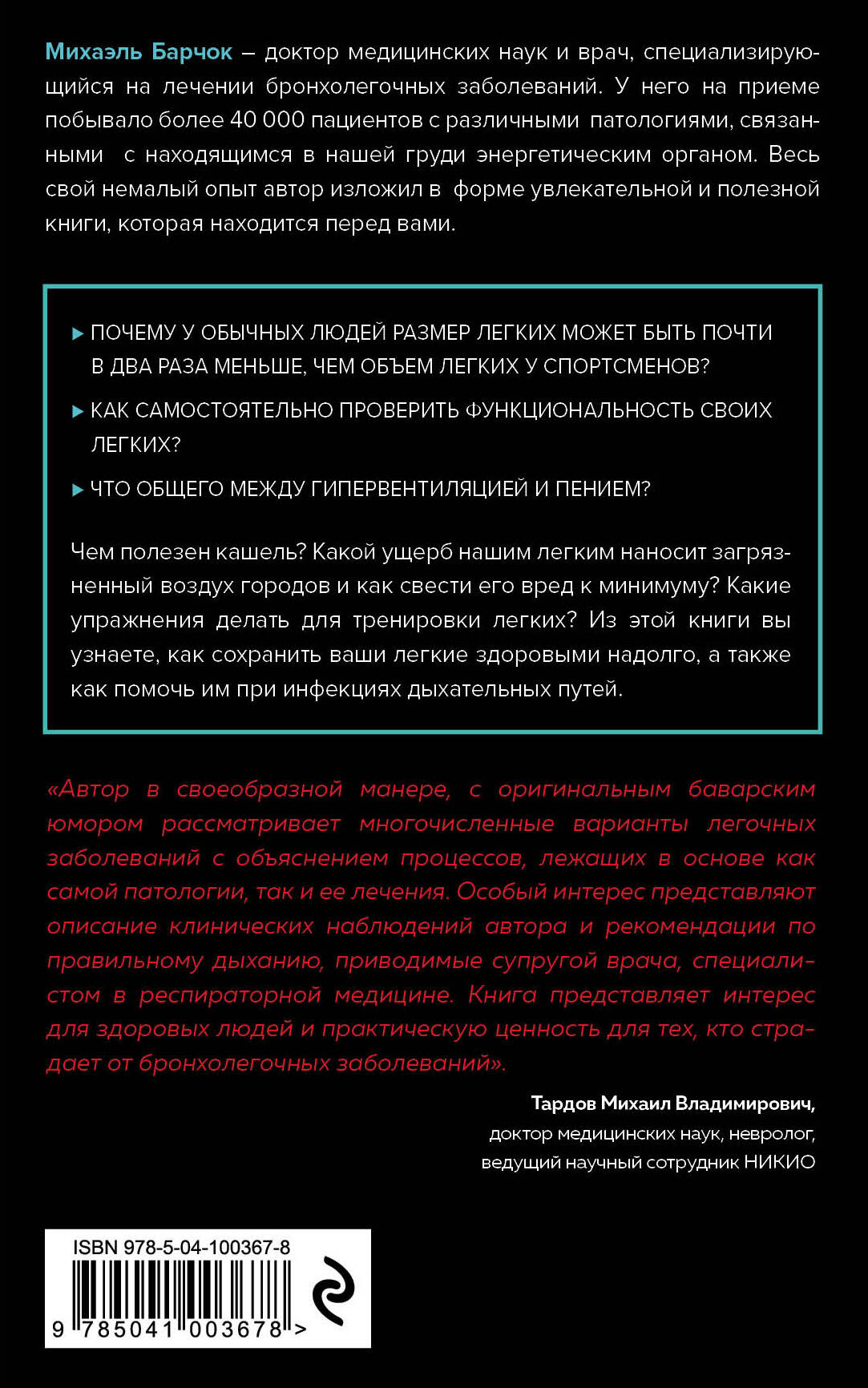 Об авторе: Михаэль Барчок, доктор медицинских наук, терапевт и врач по проблемам легких. О чем книга: Чем бы вы ни занимались - спите вы или бежите марафонскую дистанцию, - поступление в организм кислорода обычно происходит абсолютно беспрепятственно. Мы ежедневно прокачиваем через свои легкие содержимое целого теплового аэростата, перелопачиваем в своем организме гектолитры кислорода и выделяем отработанную двуокись углерода; одним словом - наше легкое это шедевр эволюции, созданный для того, чтобы мы могли в достаточной мере снабжать кислородом все свои органы - а без кислорода они функционировать никак не могут. Просто и доступно автор объясняет, как работают наши легкие и дыхательные пути, описывая это на примерах явлений природы, а также делится конкретными советами для оптимизации дыхания, адресованными как больным, так и здоровым.| Издательство | ООО "Издательство "Эксмо" |