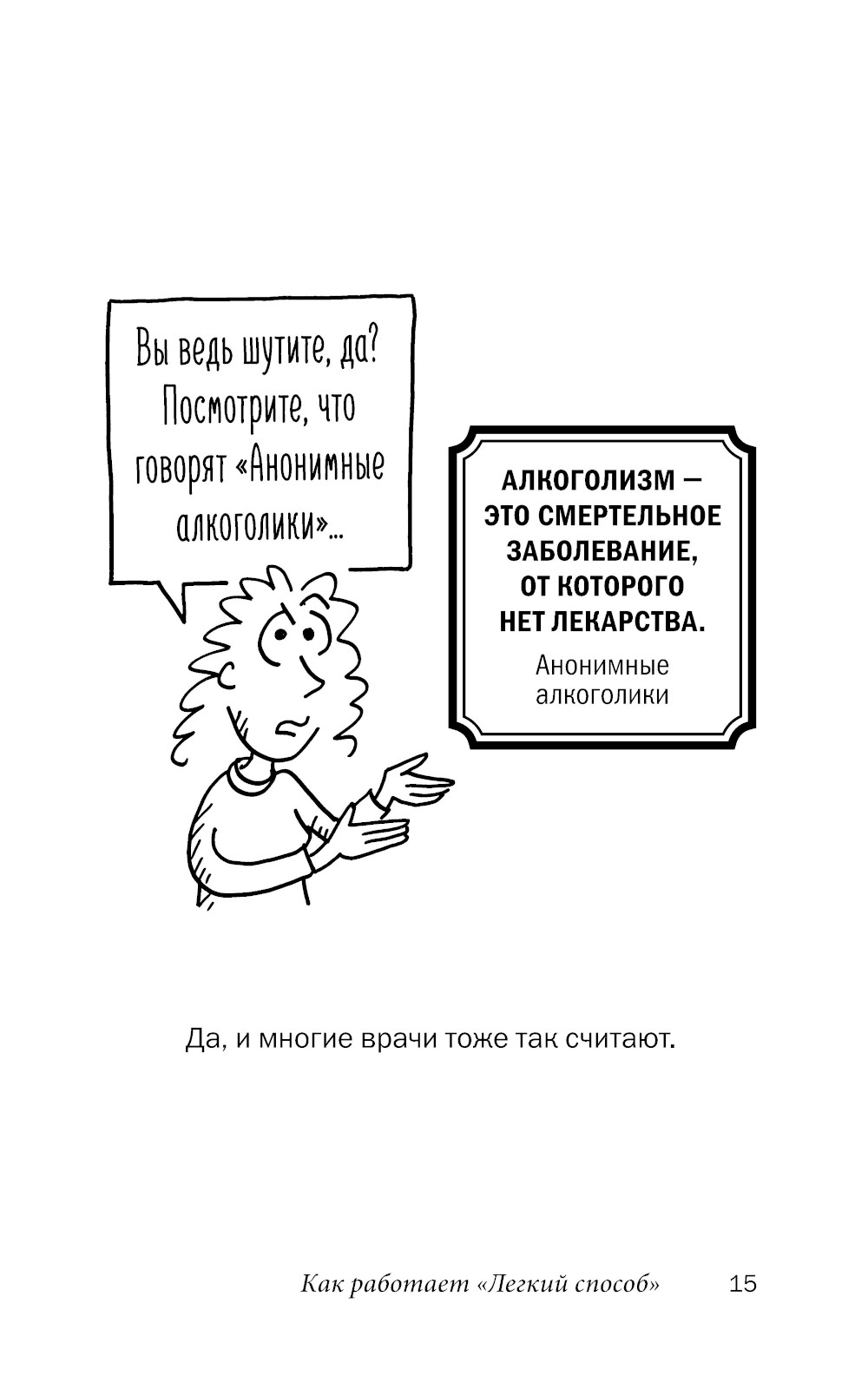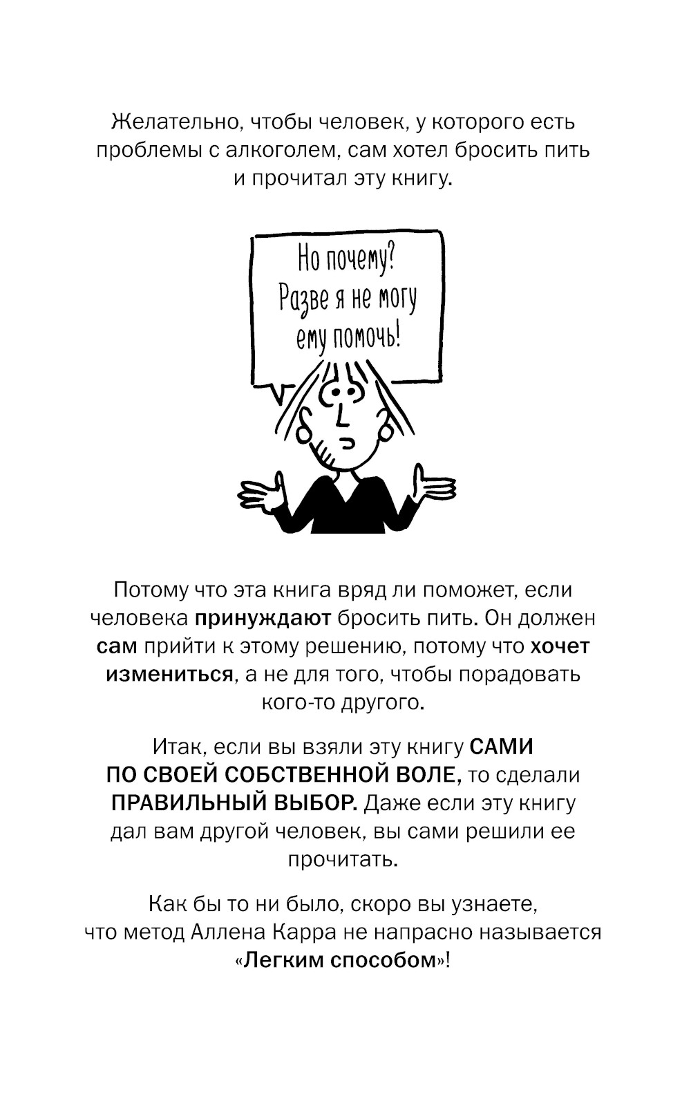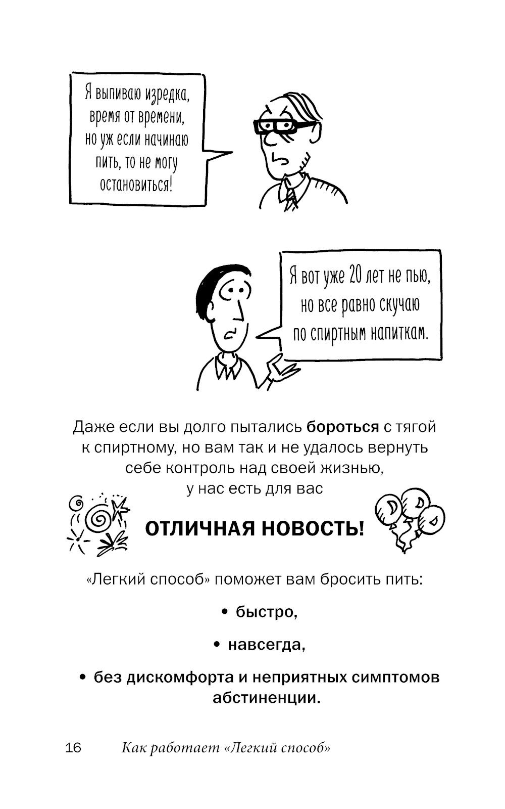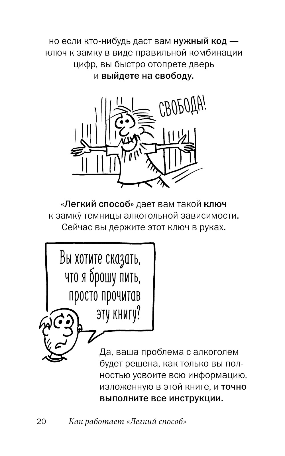 «Легкий способ» Аллена Карра уже помог миллионам людей во всем мире бросить пить - без волевых усилий, без дискомфорта и мучительного периода отвыкания, без лекарств, заменителей, гипноза и кодирования, без запугивания и банальных проповедей о вреде алкоголя, легко, быстро, навсегда. Это иллюстрированное практическое руководство поможет вам разобраться в том, почему вы начали пить спиртные напитки и продолжаете это делать несмотря на очевидные негативные последствия, и избавиться от иллюзий и предубеждений, побуждающих вас употреблять алкоголь, благодаря чему ваша тяга к спиртным напиткам исчезнет сама по себе. Прочитайте эту книгу, выполняйте содержащиеся в ней инструкции, и вы не только бросите пить, но и будете наслаждаться процессом избавления от алкогольной зависимости и жизнью без спиртных напитков. Эта книга хорошо дополняет другие книги Аллена Карра, посвященные избавлению от алкогольной зависимости -"Легкий способ бросить пить" и «Ваш личный план избавления от алкогольной зависимости».| Издательство | Добрая книга |