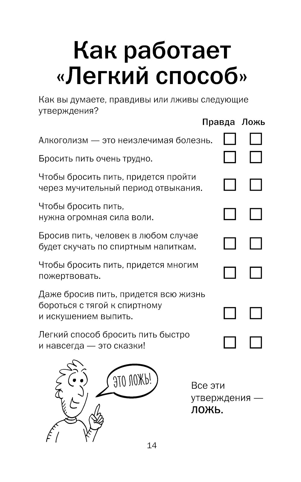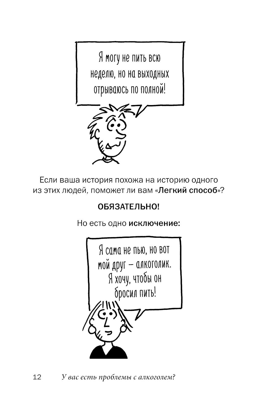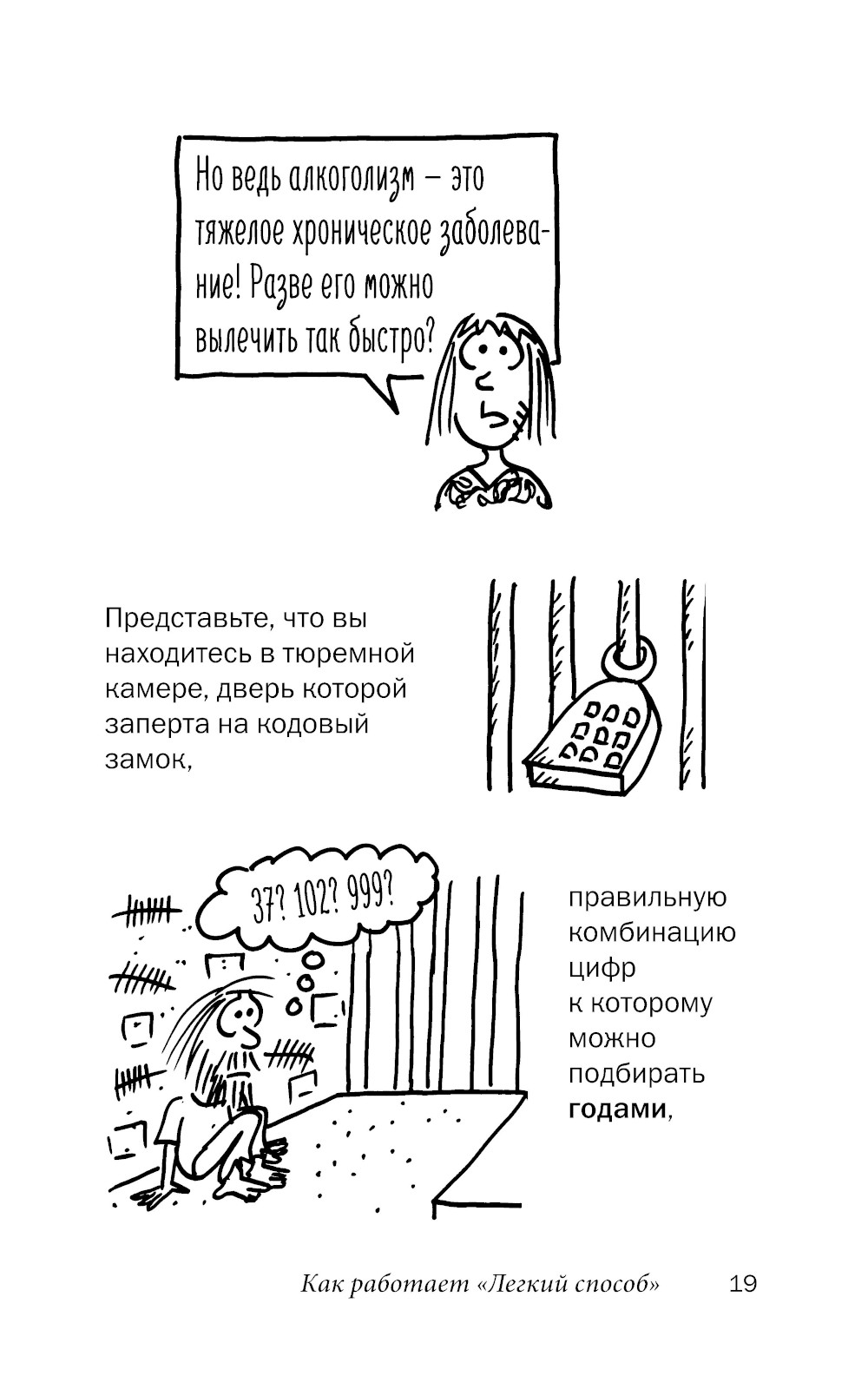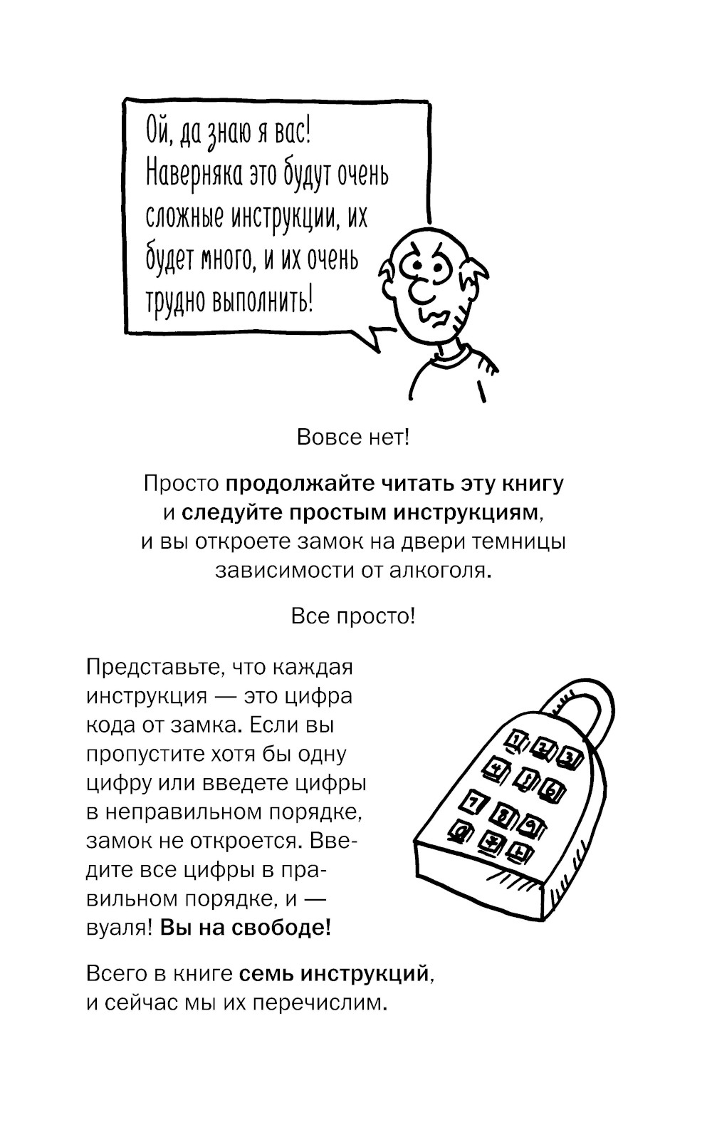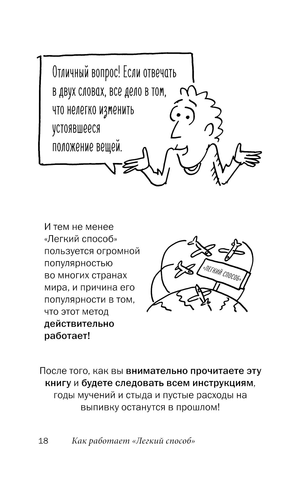 «Легкий способ» Аллена Карра уже помог миллионам людей во всем мире бросить пить - без волевых усилий, без дискомфорта и мучительного периода отвыкания, без лекарств, заменителей, гипноза и кодирования, без запугивания и банальных проповедей о вреде алкоголя, легко, быстро, навсегда. Это иллюстрированное практическое руководство поможет вам разобраться в том, почему вы начали пить спиртные напитки и продолжаете это делать несмотря на очевидные негативные последствия, и избавиться от иллюзий и предубеждений, побуждающих вас употреблять алкоголь, благодаря чему ваша тяга к спиртным напиткам исчезнет сама по себе. Прочитайте эту книгу, выполняйте содержащиеся в ней инструкции, и вы не только бросите пить, но и будете наслаждаться процессом избавления от алкогольной зависимости и жизнью без спиртных напитков. Эта книга хорошо дополняет другие книги Аллена Карра, посвященные избавлению от алкогольной зависимости -"Легкий способ бросить пить" и «Ваш личный план избавления от алкогольной зависимости».| Издательство | Добрая книга |