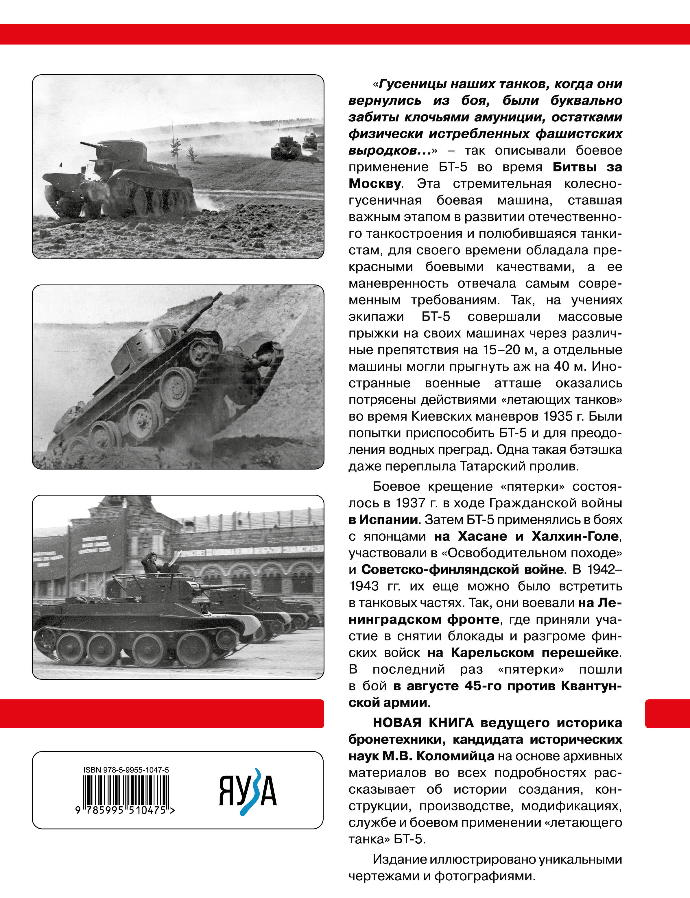 «Гусеницы наших танков, когда они вернулись из боя, были буквально забиты клочьями амуниции, остатками физически истребленных фашистских выродков…» - так описывали боевое применение БТ-5 во время Битвы за Москву. Эта стремительная колесно-гусеничная боевая машина, ставшая важным этапом в развитии отечественного танкостроения и полюбившаяся танкистам, для своего времени обладала прекрасными боевыми качествами, а ее маневренность отвечала самым современным требованиям. Так, на учениях экипажи БТ-5 совершали массовые прыжки на своих машинах через различные препятствия на 15-20 м, а отдельные машины могли прыгнуть аж на 40 м (!). Иностранные военные атташе оказались потрясены действиями «летающих танков» во время Киевских маневров 1935 г. Были попытки приспособить БТ-5 и для преодоления водных преград. Одна такая «бэтэшка» даже переплыла Татарский пролив. Боевое крещение «Пятерки» состоялось в 1937 г. в ходе Гражданской войны в Испании. Затем БТ-5 применялись в боях с японцами на Хасане и Халхин-Голе, участвовали в «Освободительном походе» и Советско-финляндской войне. В 1942-1943 гг. их еще можно было встретить в танковых частях. Так, они воевали на Ленинградском фронте, где приняли участие в снятии Блокады и разгроме финских войск на Карельском перешейке. В последний раз «Пятерки» пошли в бой в августе 45-го против Квантунской армии. НОВАЯ КНИГА ведущего историка бронетехники, кандидата исторических наук М.В. Коломийца на основе архивных материалов во всех подробностях рассказывает об истории создания, конструкции, производстве, модификациях, службе и боевом применении «летающего танка» БТ-5. Издание иллюстрировано уникальными чертежами и фотографиями.| Издательство | Яуза-пресс ООО |