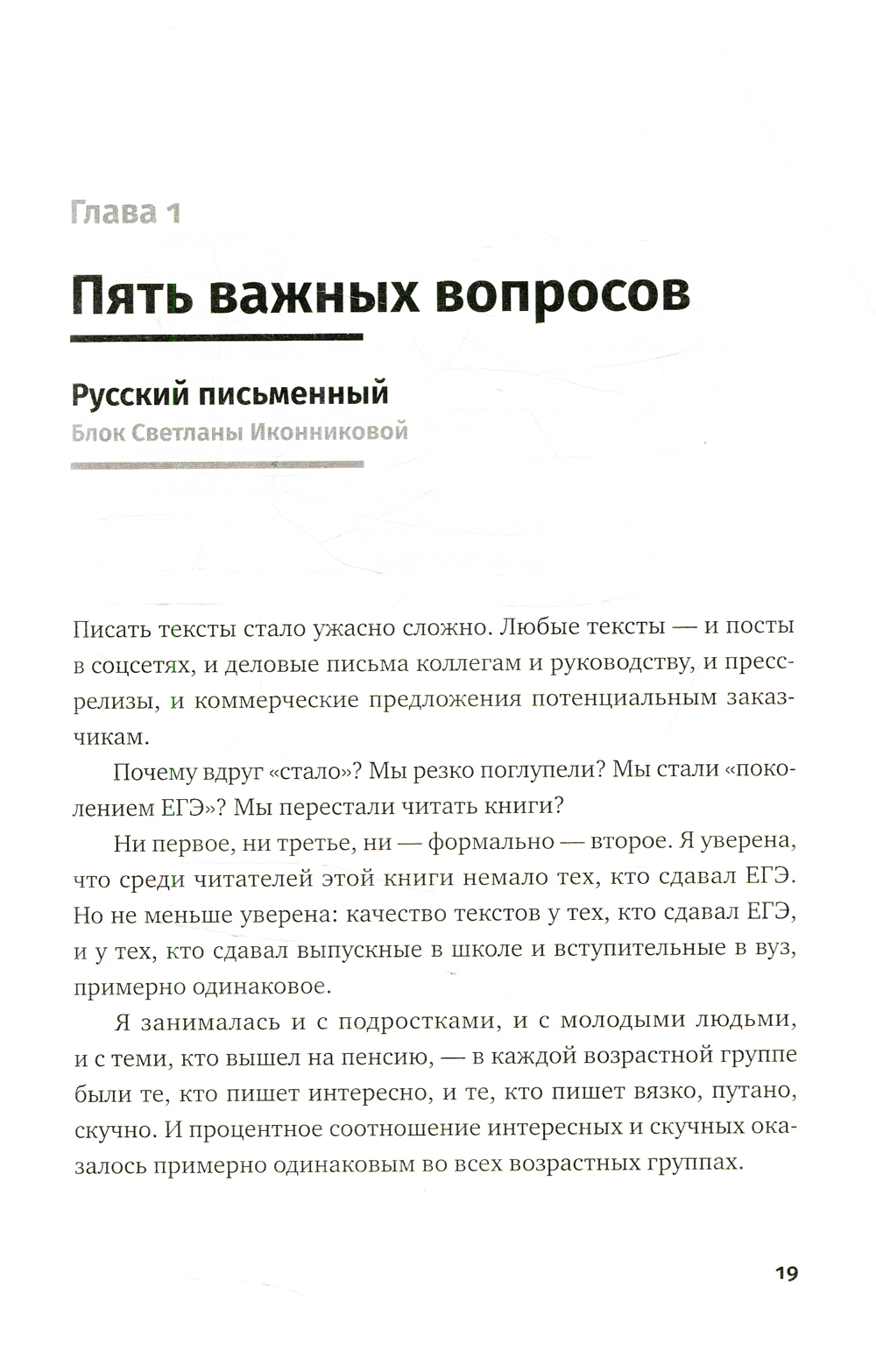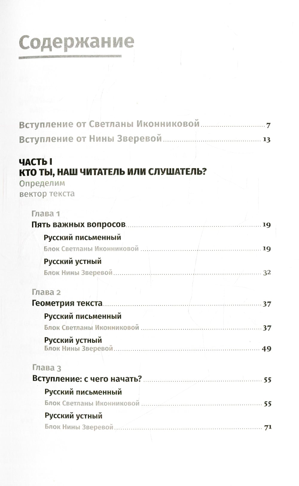 Немало успешных спикеров с трудом пишут тексты, и ничуть не меньше успешных авторов весьма бледно смотрятся на сцене. Все дело в том, что речь устная и речь письменная - это два разных вида речи. И чтобы быть правильно понятыми, нам необходимо умение точно и увлекательно излагать мысли устно и письменно, о чем бы ни шла речь. Письма, сообщения, посты в соцсетях, тексты для публичных выступлений, рассказы о путешествиях или событиях - важно, чтобы тексты было приятно и читать, и слушать. В этой книге Светлана Иконникова, тренер по написанию текстов, рассказывает, как точно и убедительно излагать мысли в деловой переписке, соцсетях и мессенджерах, а Нина Зверева, известная телеведущая, бизнес-тренер, автор бестселлеров, объяснит, как создать идеальный текст для выступления. Как передать интонацию на письме, что такое геометрия и вектор текста, с чего он должен начинаться, для кого пишется, как зацепить внимание слушателя и читателя с первой фразы, интересные истории из практики, упражнения и советы - эта книга для тех, кто хочет, чтобы его читали, смотрели и слушали.| Издательство | Альпина Паблишер |