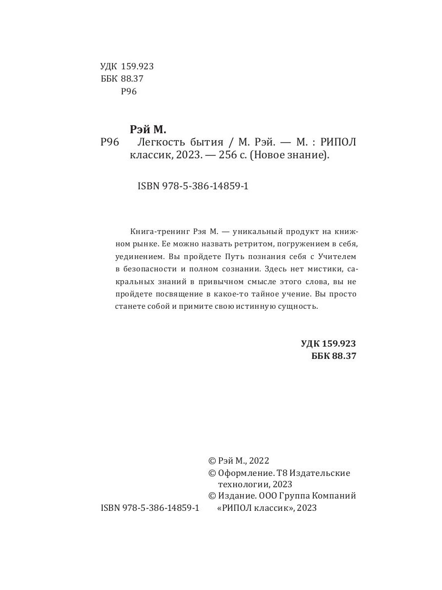 Книга-тренинг Рэя М. - уникальный продукт на книжном рынке. Её можно назвать ретритом, погружением в себя, уединением. Вы пройдете Путь познания себя с Учителем в безопасности и полном сознании. Здесь нет мистики, сакральных знаний в привычном смысле этого слова, вы не пройдете посвящение в какое-то тайное учение. Вы просто станете собой и примите свою истинную сущность.| Издательство | Рипол Классик |