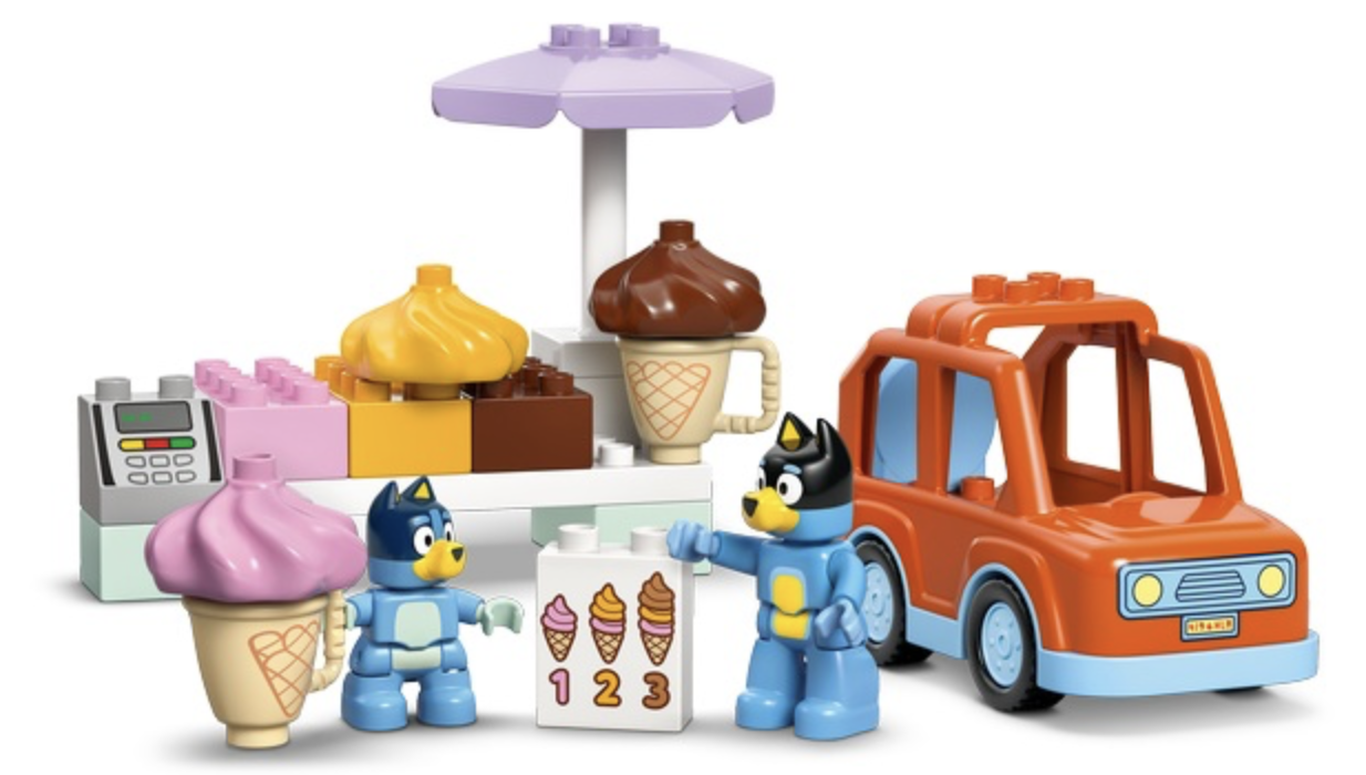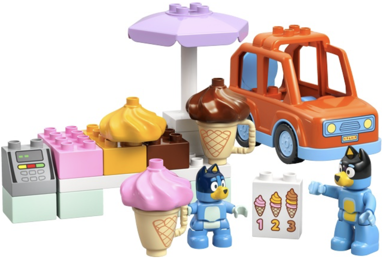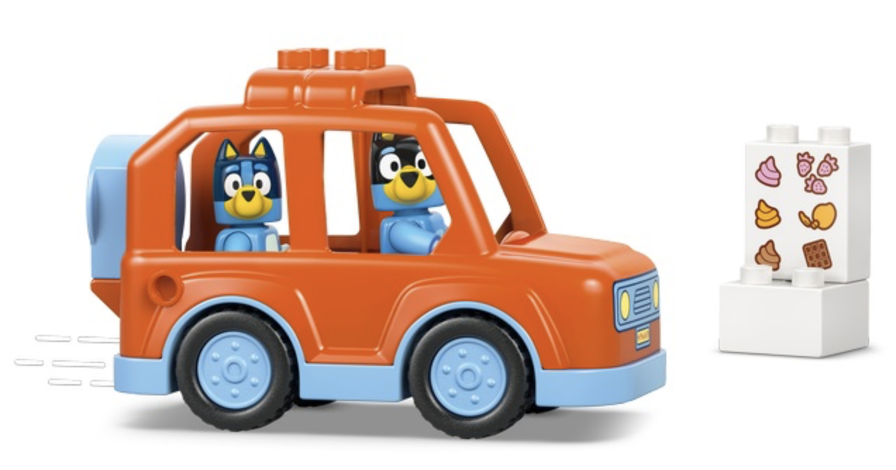В комплект входит: Карт с мороженым, две минифигурки (Блуи и Бинго), рожки мороженого и другие аксессуары.