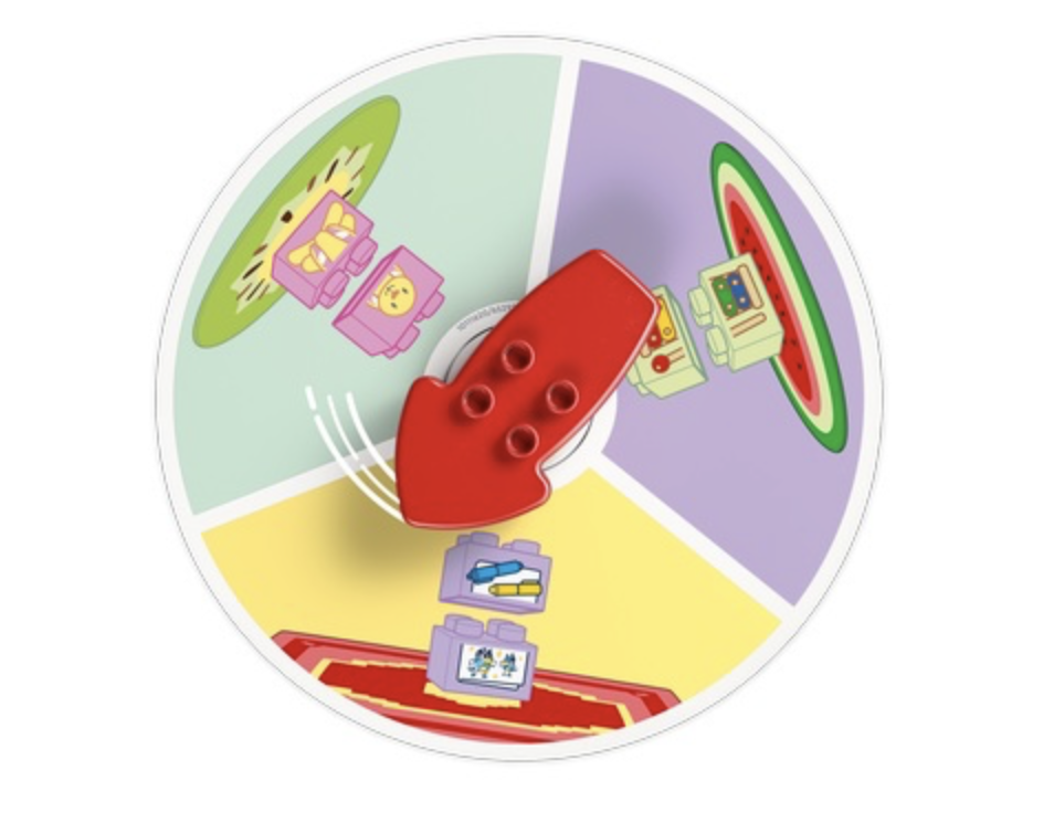 Элемент игры на память с вращающейся стрелкой и открывающимися окнами помогает развивать память и навыки сравнения.