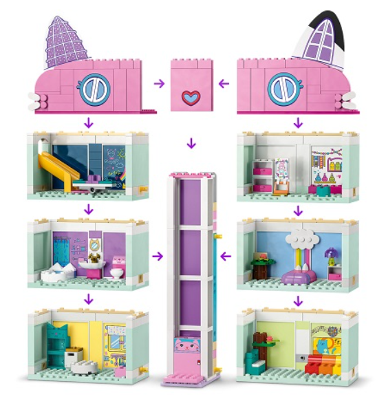 В кукольном домике Габби есть 8 красочных комнат, соединенных раздвижным лифтом. Каждая комната наполнена развлечениями. Например, дети могут печь на кухне, использовать горку в игровой комнате, проявлять творческий подход в художественной комнате, играть на пианино в музыкальной комнате, баловать себя в ванной, вздремнуть в спальне или отправиться на крышу, чтобы потанцевать. вечеринка на вращающейся танцполе. Дети делятся своими приключениями с четырьмя популярными персонажами сериала: Габби, Панди Поус, Кейки и МерКэт.